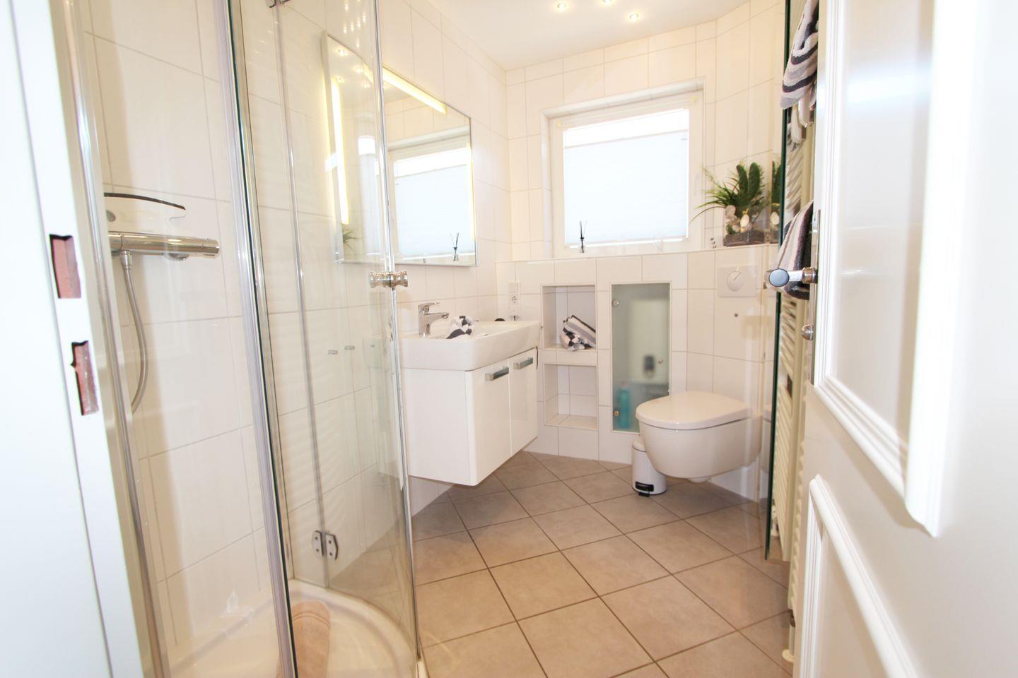 Das helle, freundliche Duschbad mit WC bietet vollen Komfort. Starten Sie erfrischt in den Tag und waschen Sie am Abend den Sand von Ihren Füßen.