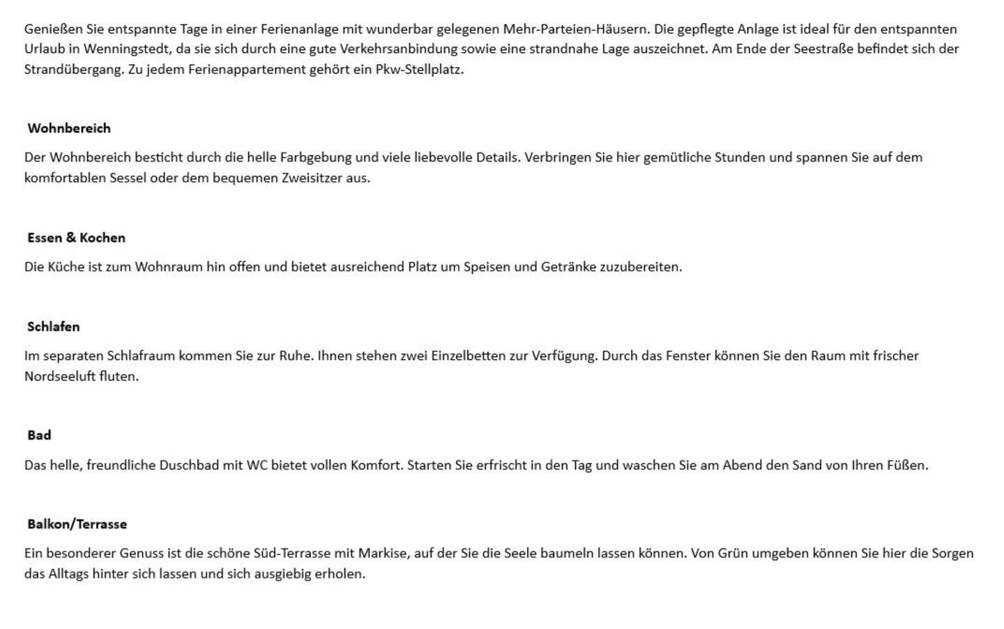 Genießen Sie entspannte Tage in einer Ferienanlage mit wunderbar gelegenen Mehr-Parteien-Häusern. Die gepflegte Anlage ist ideal für den entspannten Urlaub in Wenningstedt, da sie sich durch eine gute Verkehrsanbindung sowie eine strandnahe Lage auszeichnet. Am Ende der Seestraße befindet sich der Strandübergang. Zu jedem Ferienappartement gehört ein Pkw-Stellplatz.
