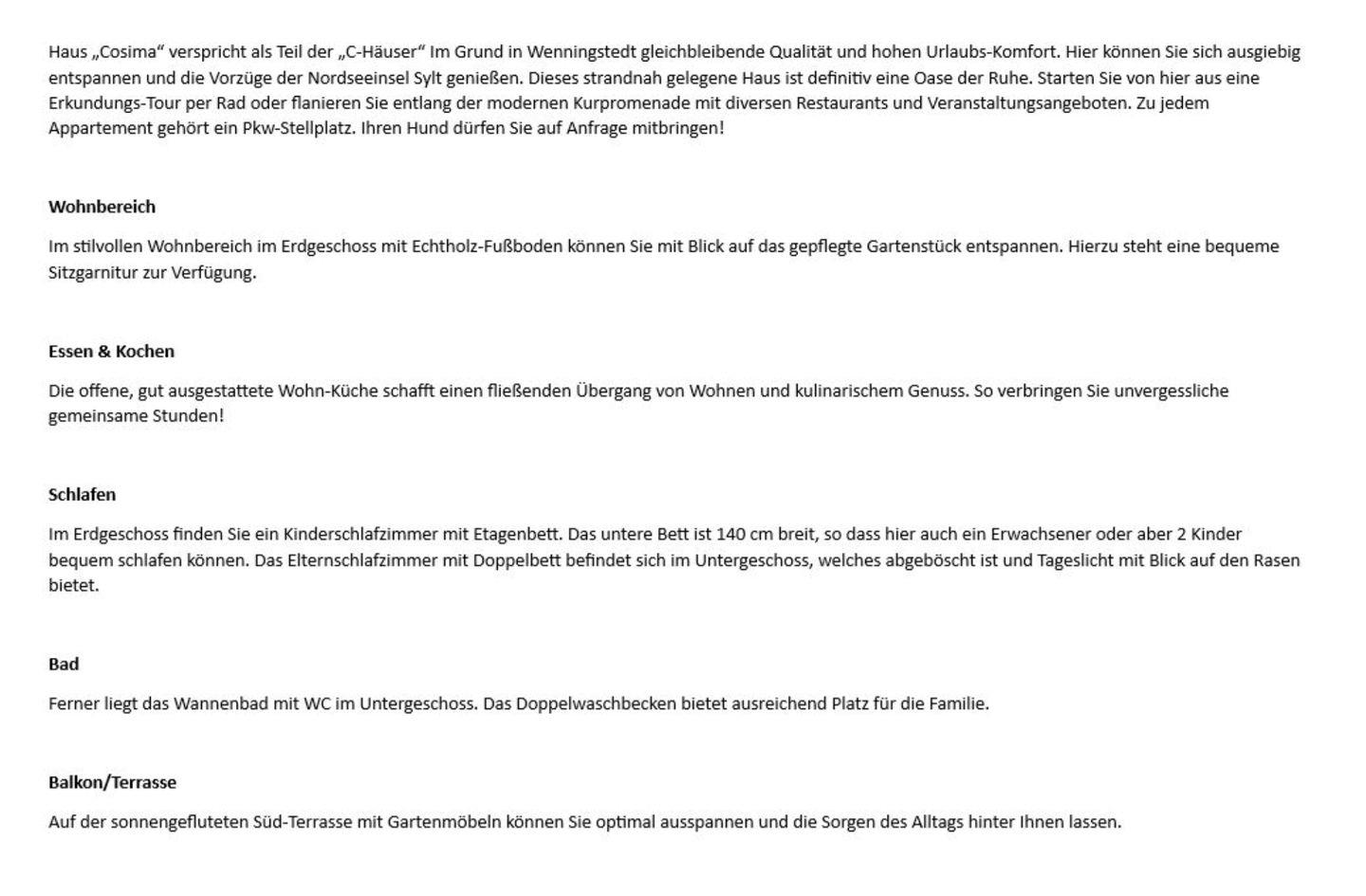 Haus „Cosima“ verspricht als Teil der „C-Häuser“ Im Grund in Wenningstedt gleichbleibende Qualität und hohen Urlaubs-Komfort. Hier können Sie sich ausgiebig entspannen und die Vorzüge der Nordseeinsel Sylt genießen. Dieses strandnah gelegene Haus ist definitiv eine Oase der Ruhe. Starten Sie von hier aus eine Erkundungs-Tour per Rad oder flanieren Sie entlang der modernen Kurpromenade mit diversen Restaurants und Veranstaltungsangeboten. Zu jedem Appartement gehört ein Pkw-Stellplatz. Ihren Hund dürfen Sie auf Anfrage mitbringen!