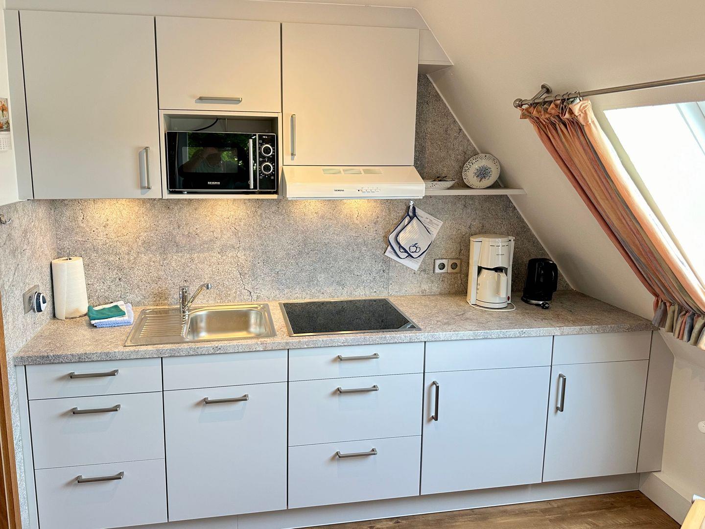 praktische Küchenzeile ist voll ausgestattet, inklusive Mikrowelle, und die