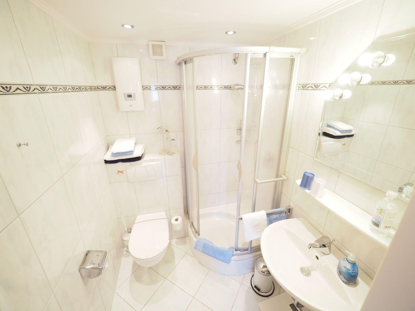 befindet sich das hochwertig ausgestattete Duschbad, das für zusätzlichen