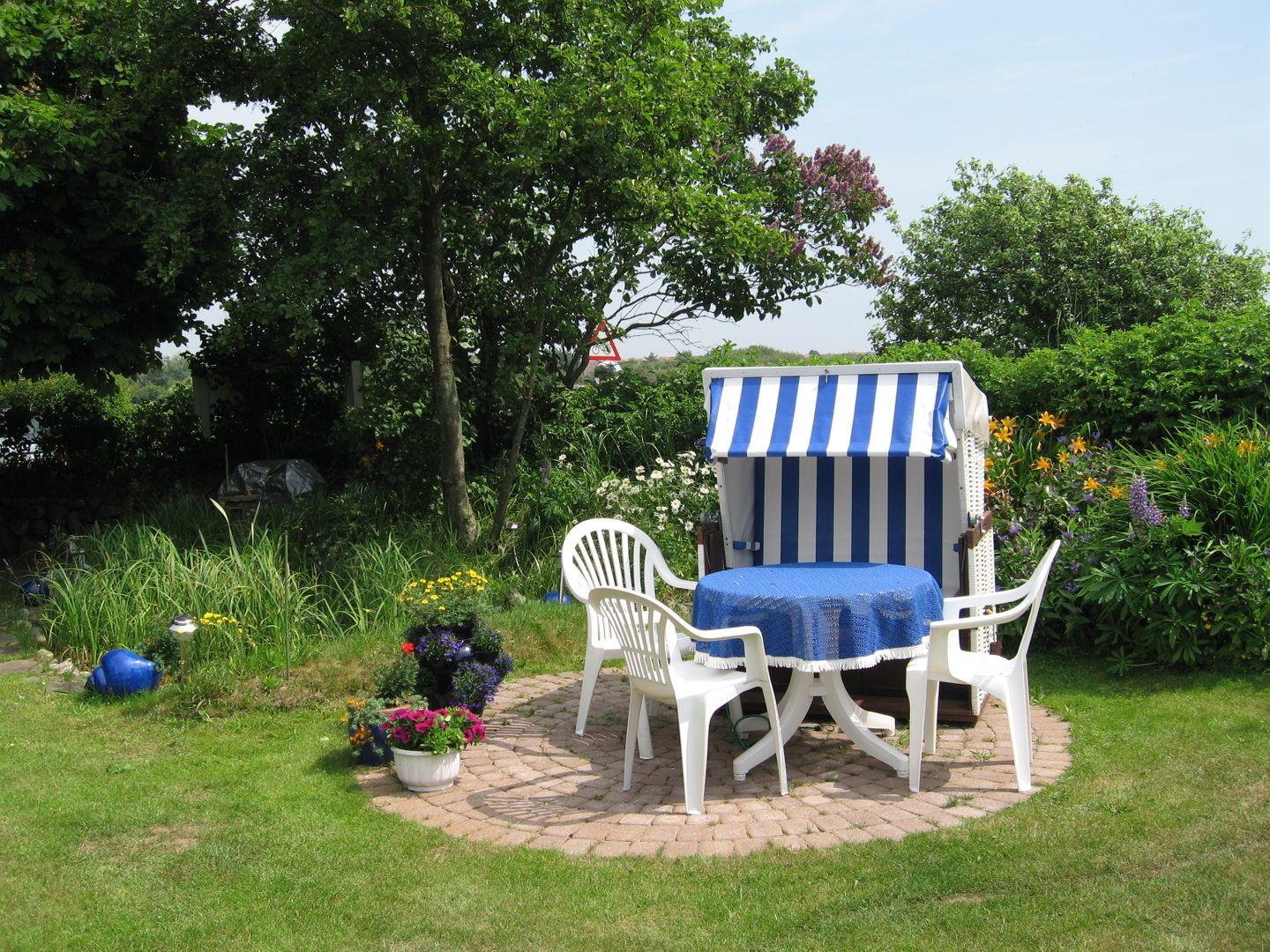 Garten mit Gartenmöbeln und einem Strandkorb zur Mitbenutzung zur Verfügung –