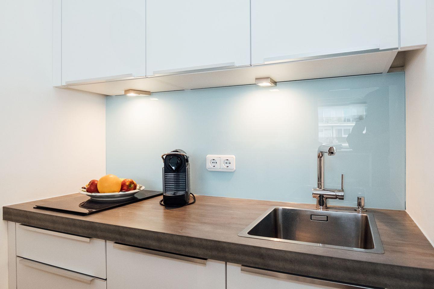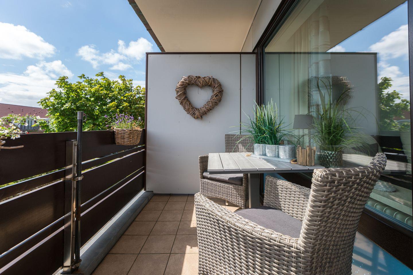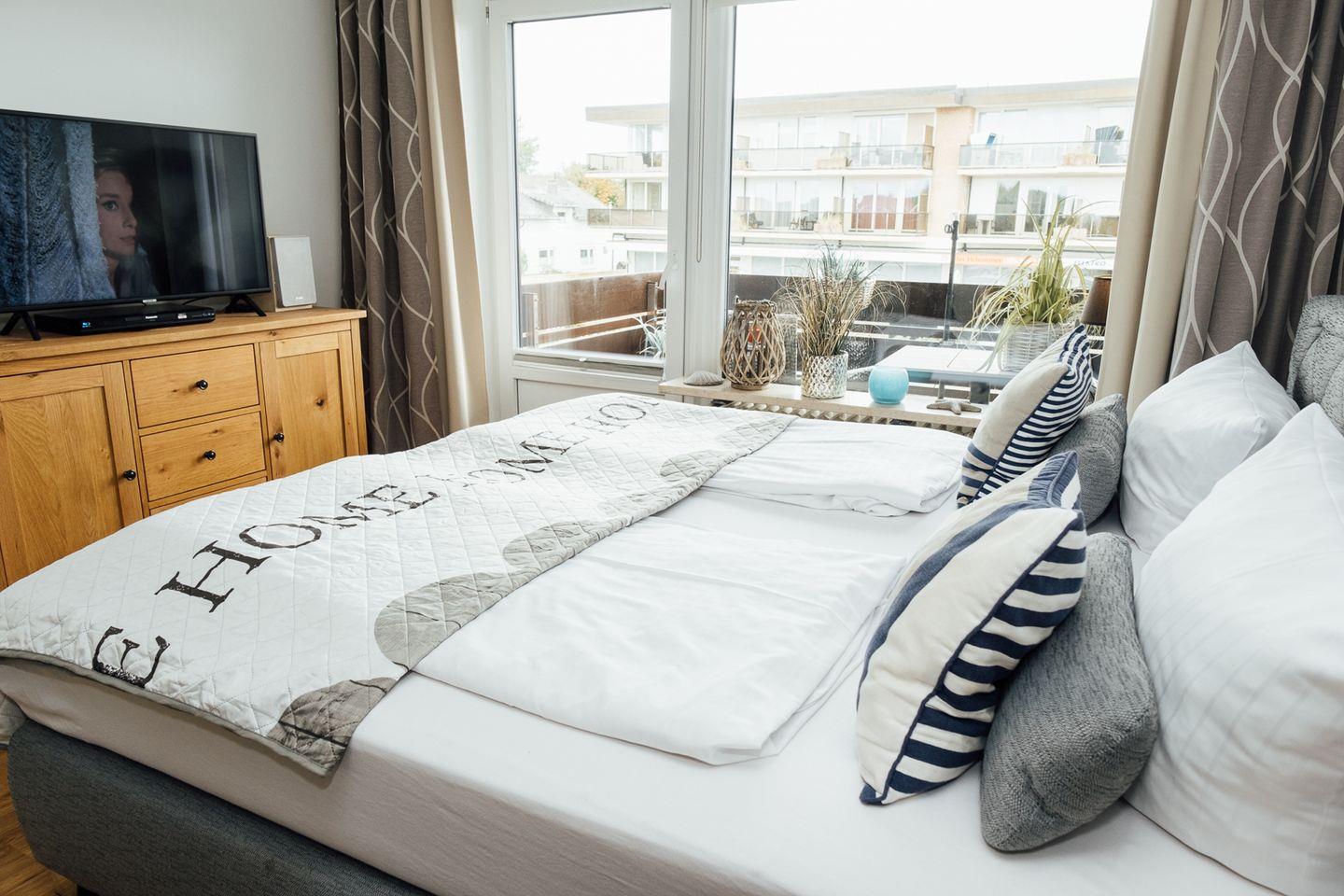 Der moderne Wohn/Schlafraum mit offener Einbauküche bietet ein komfortables Boxspringbett. Eine moderne Ausstattung, u.a. mit hochwertigem Flat-TV, Stereoanlage mit Bluetooth-Anschluss, DVD-Player sowie W-Lan sind selbstverständlich. Der mit bequemen Sesseln und einem kleinen Tisch möblierte Balkon vervollständigt das schöne und elegante Gesamtbild. Wir wünschen Ihnen viel Spaß und gute Erholung. WLAN vorhanden (ohne Gewähr)