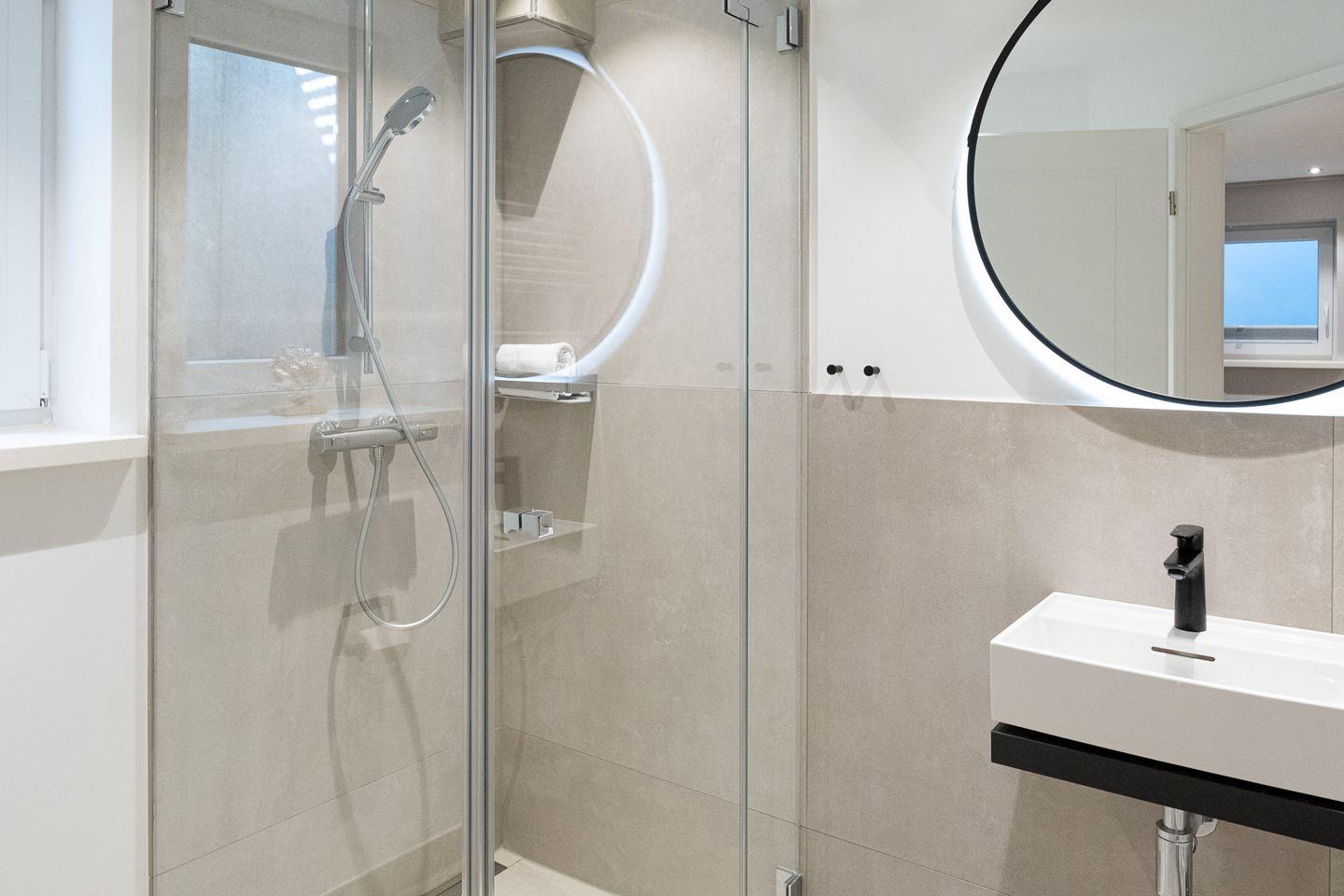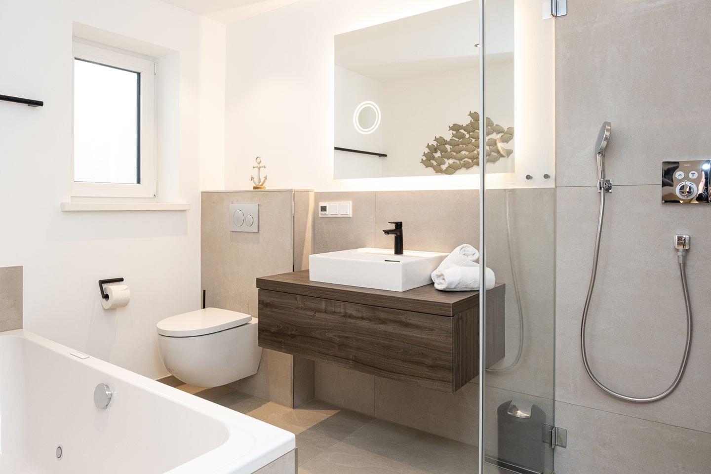 Im UG des Hauses befinden sich drei große und helle Schlafräume mit hochwertigen Boxspringbetten (180 x 200) und Smart-TV. Jedes Schlafzimmer verfügt über ein eigenen en suite Badezimmer. Alle Bäder sind mit Dusche, WC und zwei Bäder zusätzlich mit Whirlwanne ausgestattet. Ebenfalls im UG befindet sich die luxuriöse Sauna. Angrenzend an die Sauna befindet sich ein weiteres Badezimmer mit Dusche/WC. Ein Waschtrockner steht ebenfalls zur Verfügung (gebührenfrei)