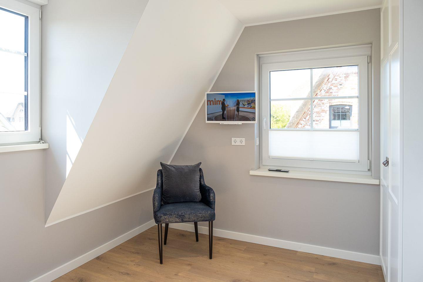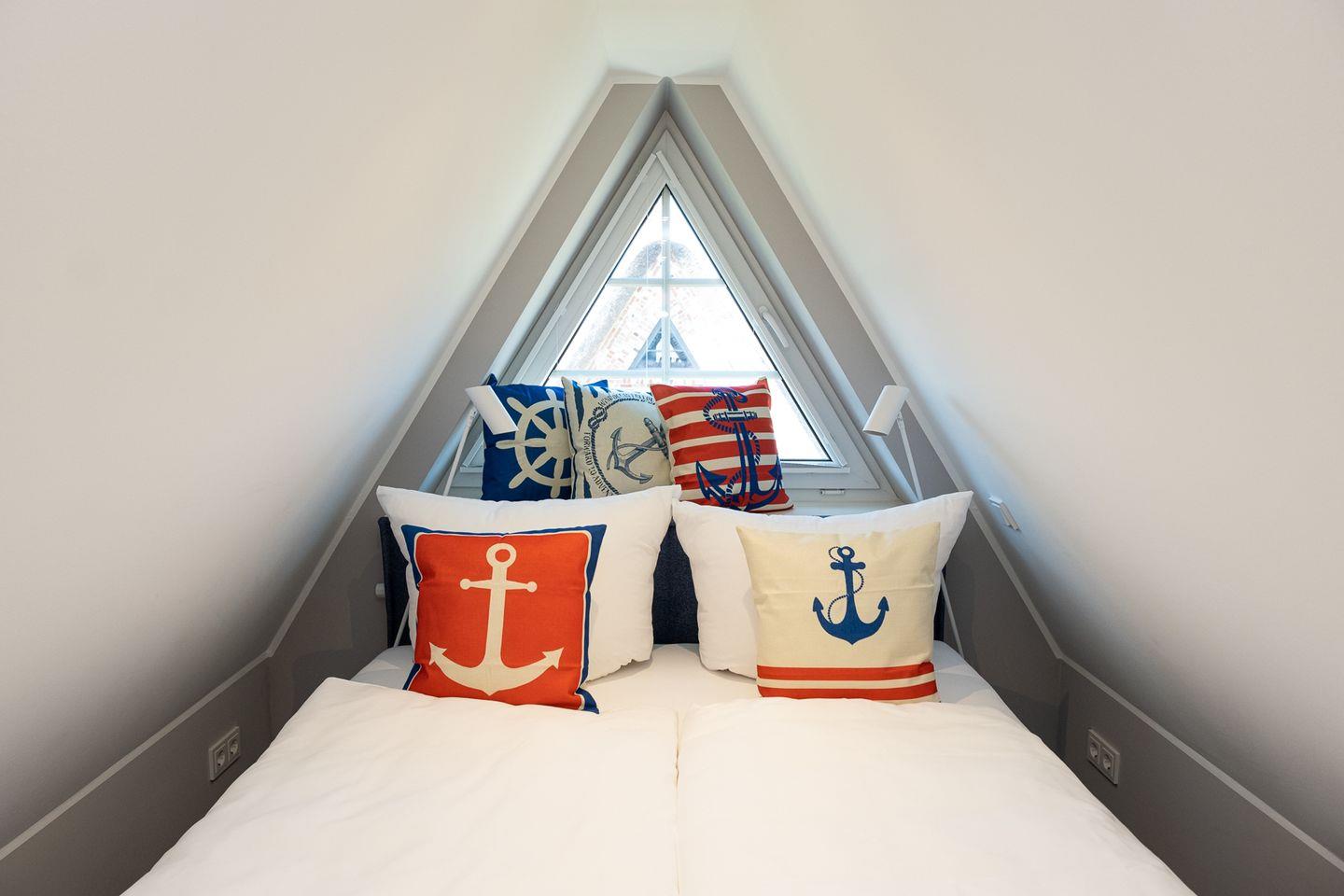Im Dachgeschoss des Hauses befindet sich ein weiterer (offener) Schlafraum mit Boxspringbett (180x200)