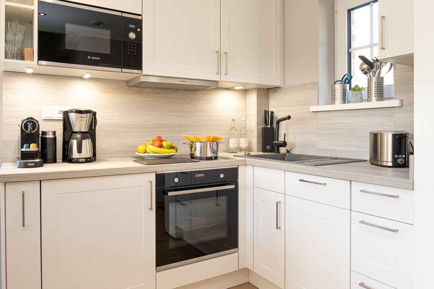 Die moderne und offene Küche ist komplett ausgestattet mit einem Backofen, einer Mikrowelle, Geschirrspülmaschine, Filter-Kaffeemaschine, Nespresso-Kapselmaschine, Toaster und Wasserkocher.