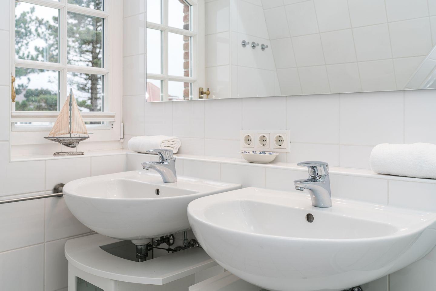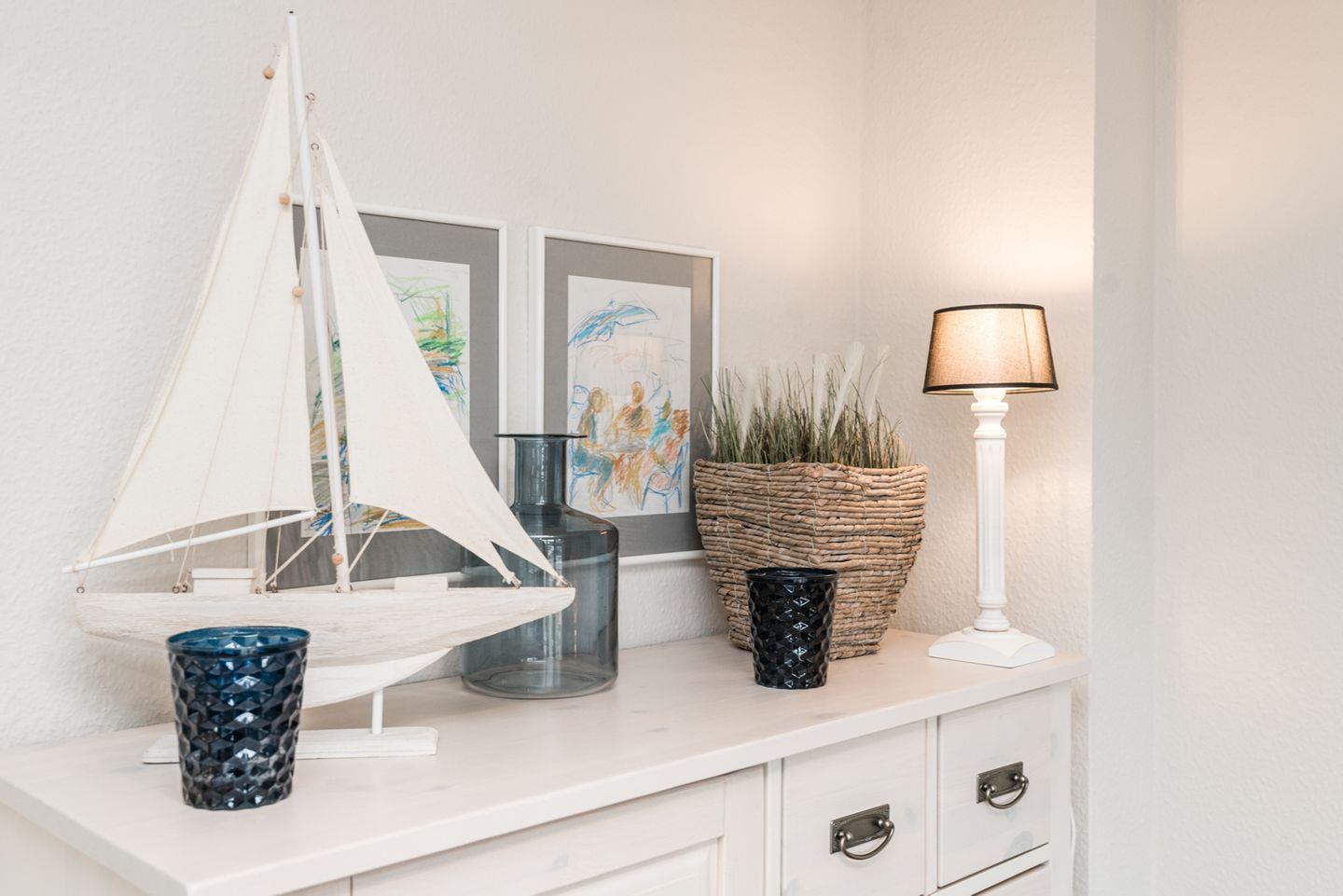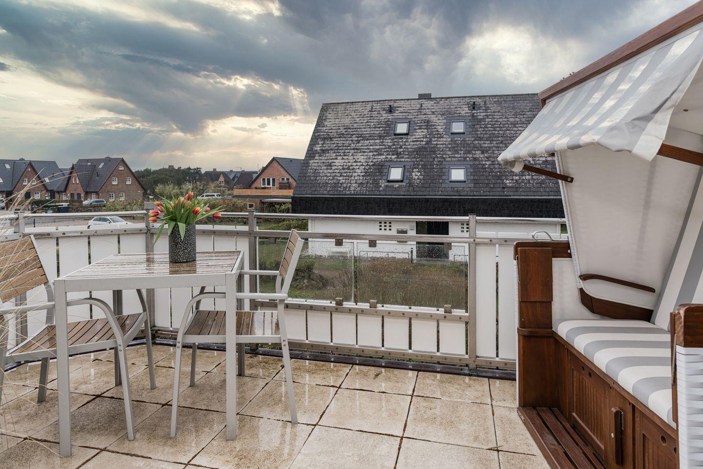 Im OG. befindet sich der helle und sehr schön eingerichtete Wohnraum mit Zugang zu dem sonnigen und großzügig bemessenen Westbalkon mit Strandkorb. Die separate Küche ist voll ausgestattet. 1 Schlafraum mit Doppelbett und hochwertigen Einbauschränken. 1 helles Duschbad mit Doppelwaschbecken und WC.