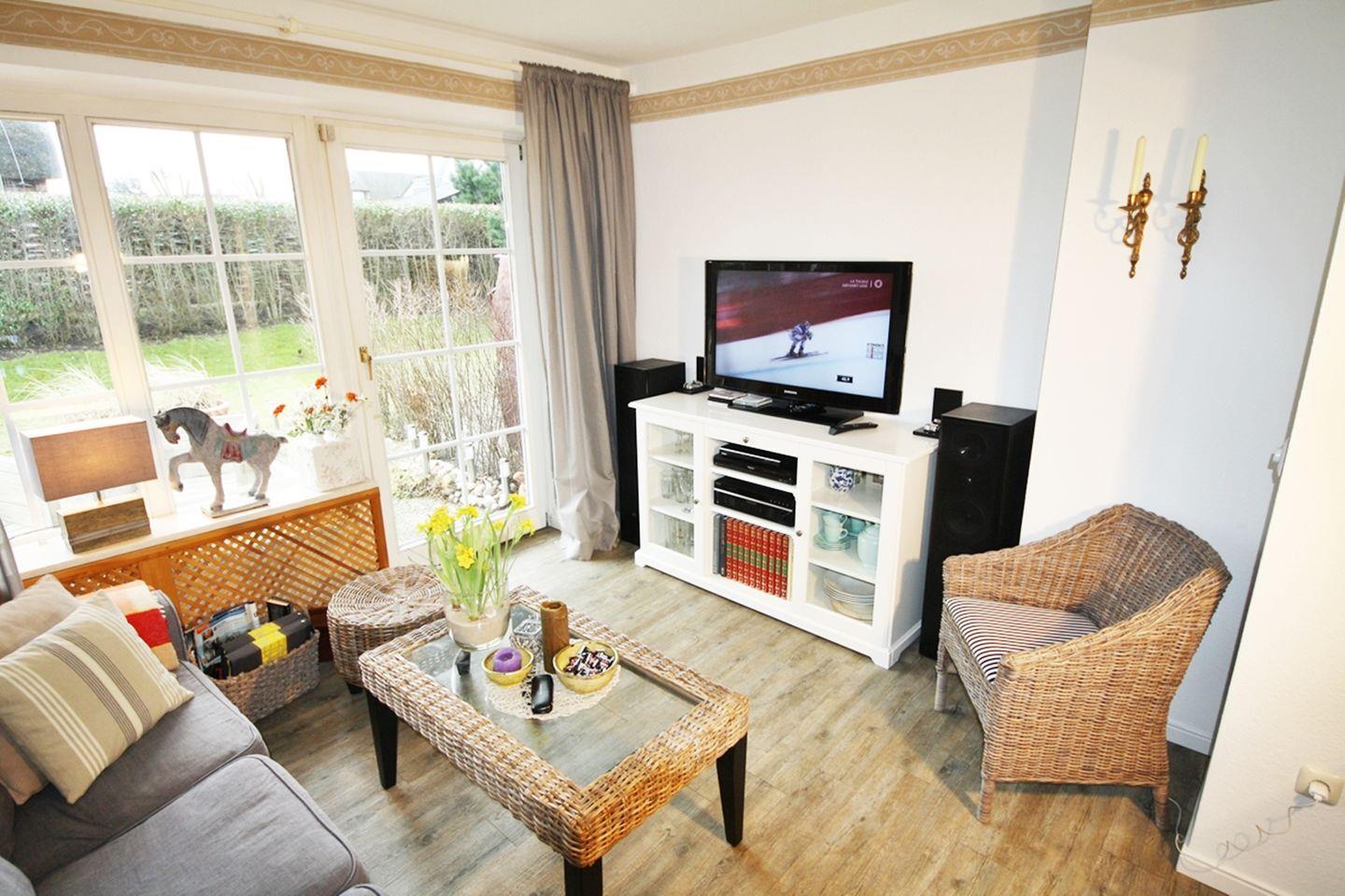 Auf der Terrasse, welche nach Süden ausgerichtet ist, steht für Sie eine gemütliche Lounge-Ecke, sowie ein hochwertiger Strandkorb zur Verfügung. Genießen Sie auf der Terrasse ruhige und entspannte Stunden