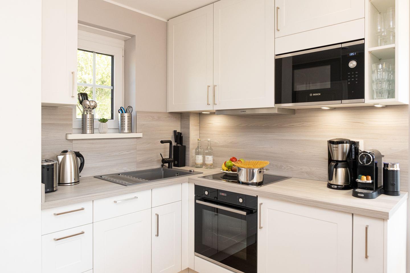 Die moderne und offene Küche ist komplett ausgestattet mit einem Backofen, einer Mikrowelle, Geschirrspülmaschine, Filter-Kaffeemaschine, Nespresso-Kapselmaschine, Toaster und Wasserkocher.