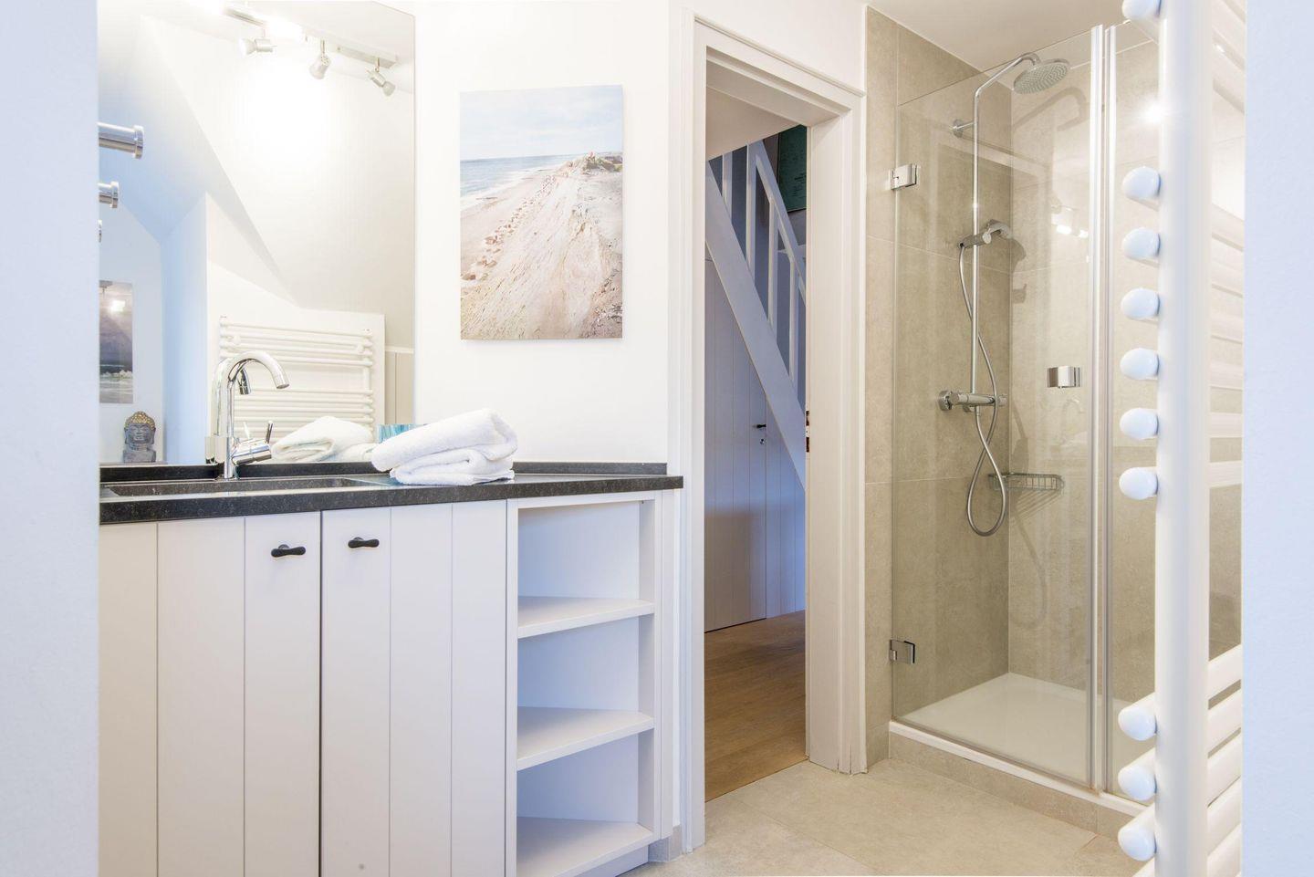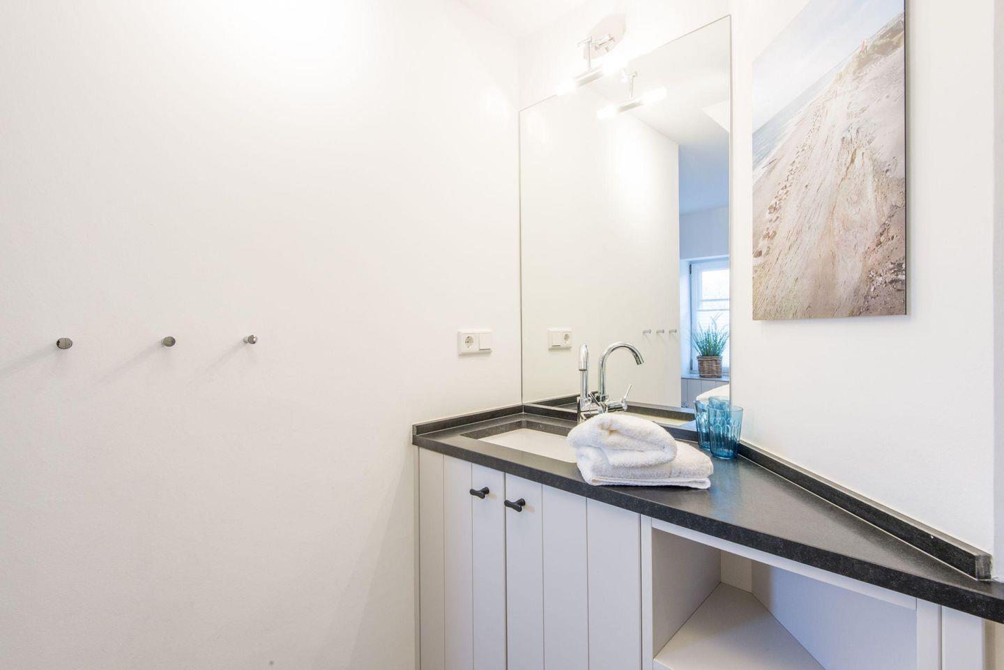 Das moderne Badezimmer verfügt über eine ebenerdige Dusche, WC, Handtuchwärmer, Föhn und Tageslicht. Der gemeinschaftliche Wellnessbereich des Hauses bietet eine Sauna und einen Ruheraum für entspannte Stunden.
