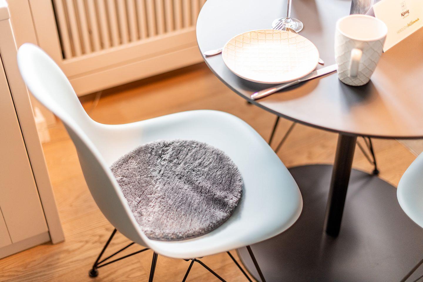 Das stilvolle Wohnzimmer mit einer gemütlichen Schlafcouch (140x200 cm) und TV schafft eine entspannte Atmosphäre. Die runde Sitzgruppe für vier Personen lädt zu gemeinsamen Mahlzeiten und geselligen Abenden ein.