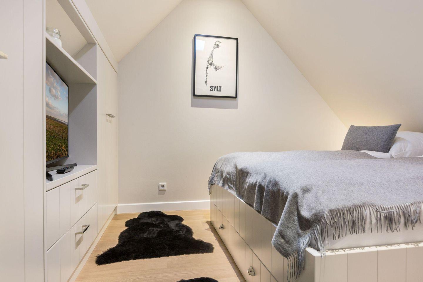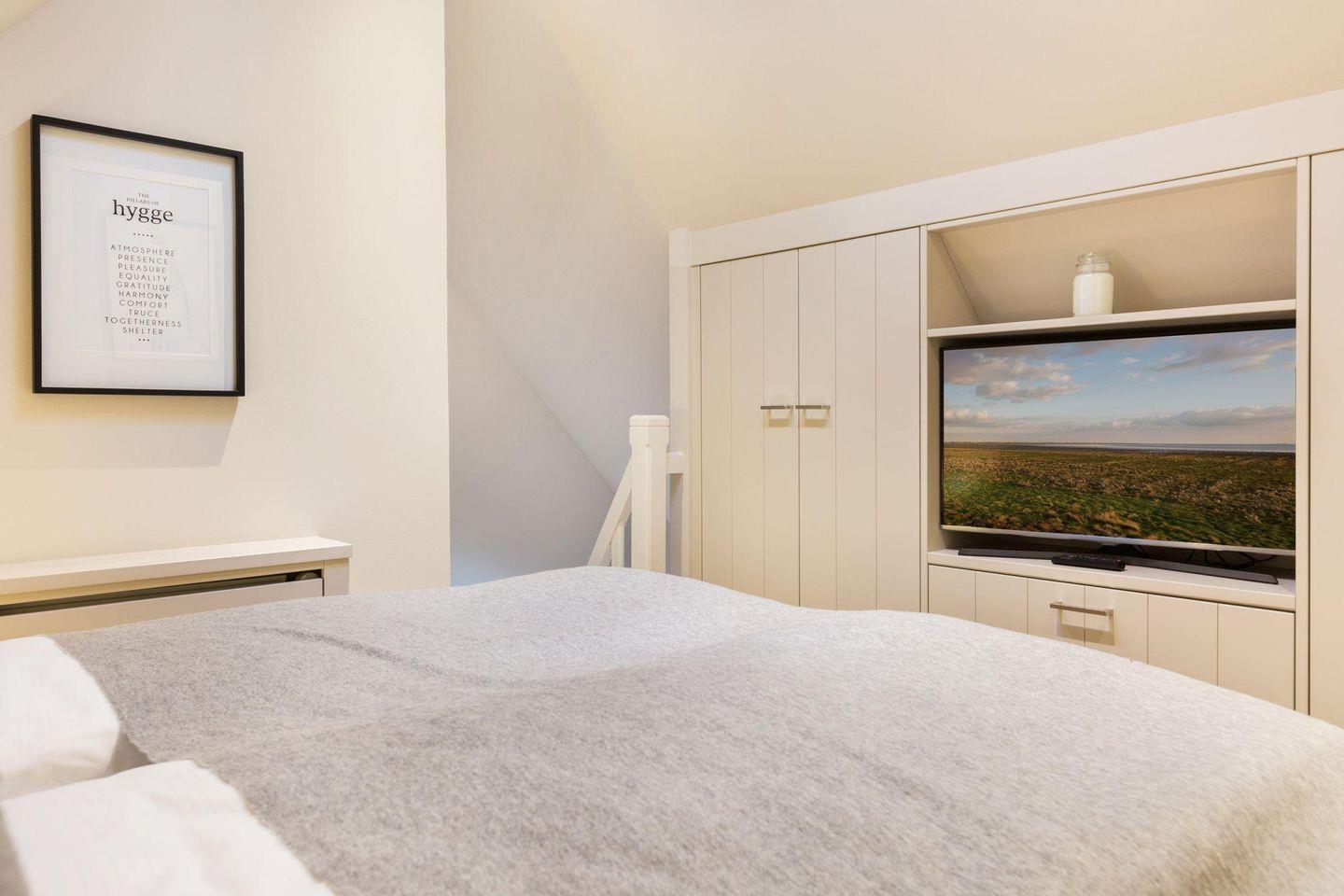 Das Schlafzimmer im Dachgeschoss verfügt über ein komfortables Doppelbett (2 x 90x200 cm), einen praktischen Einbauschrank und TV und bietet eine erholsame Atmosphäre.