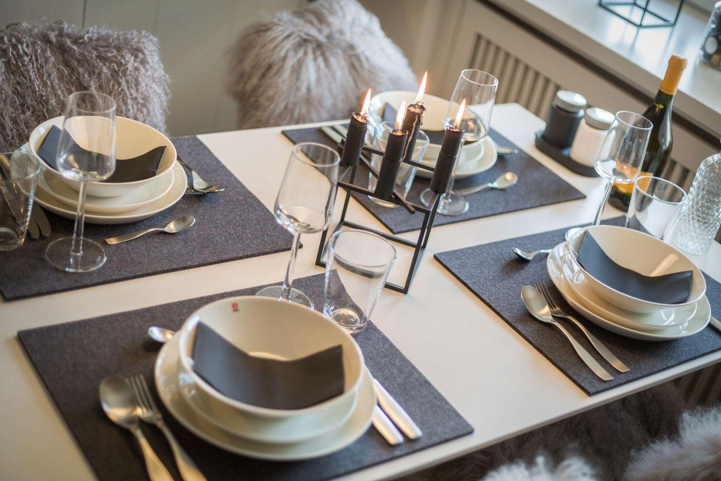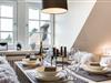 Das exklusive Wohnzimmer verfügt über eine bequeme Schlafcouch (140x200 cm) und TV. Die Sitzgruppe mit vier Stühlen lädt zu gemeinsamen Mahlzeiten oder entspannten Abenden ein.