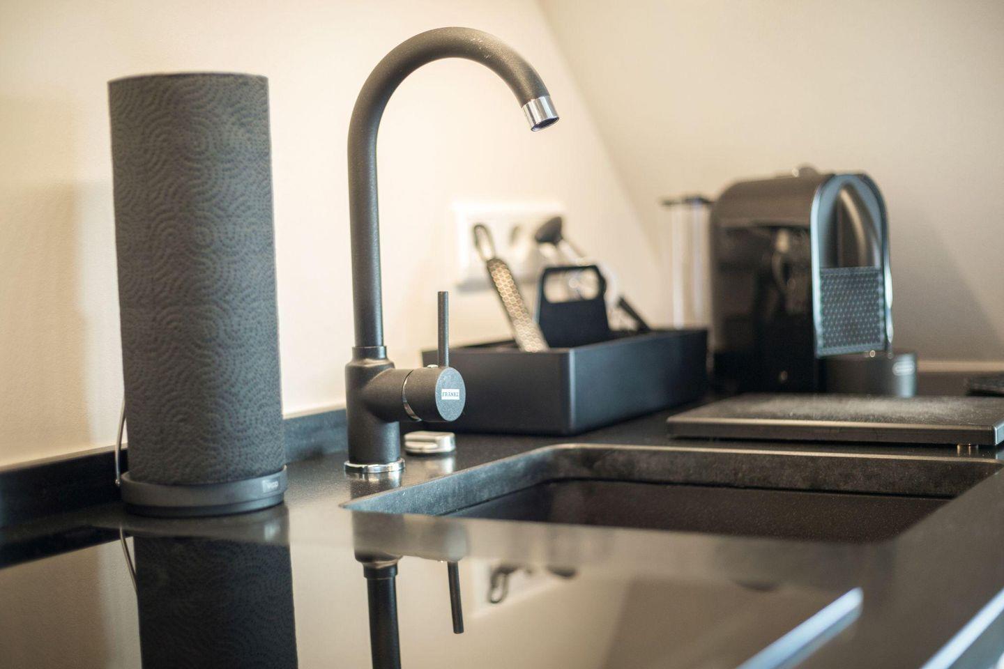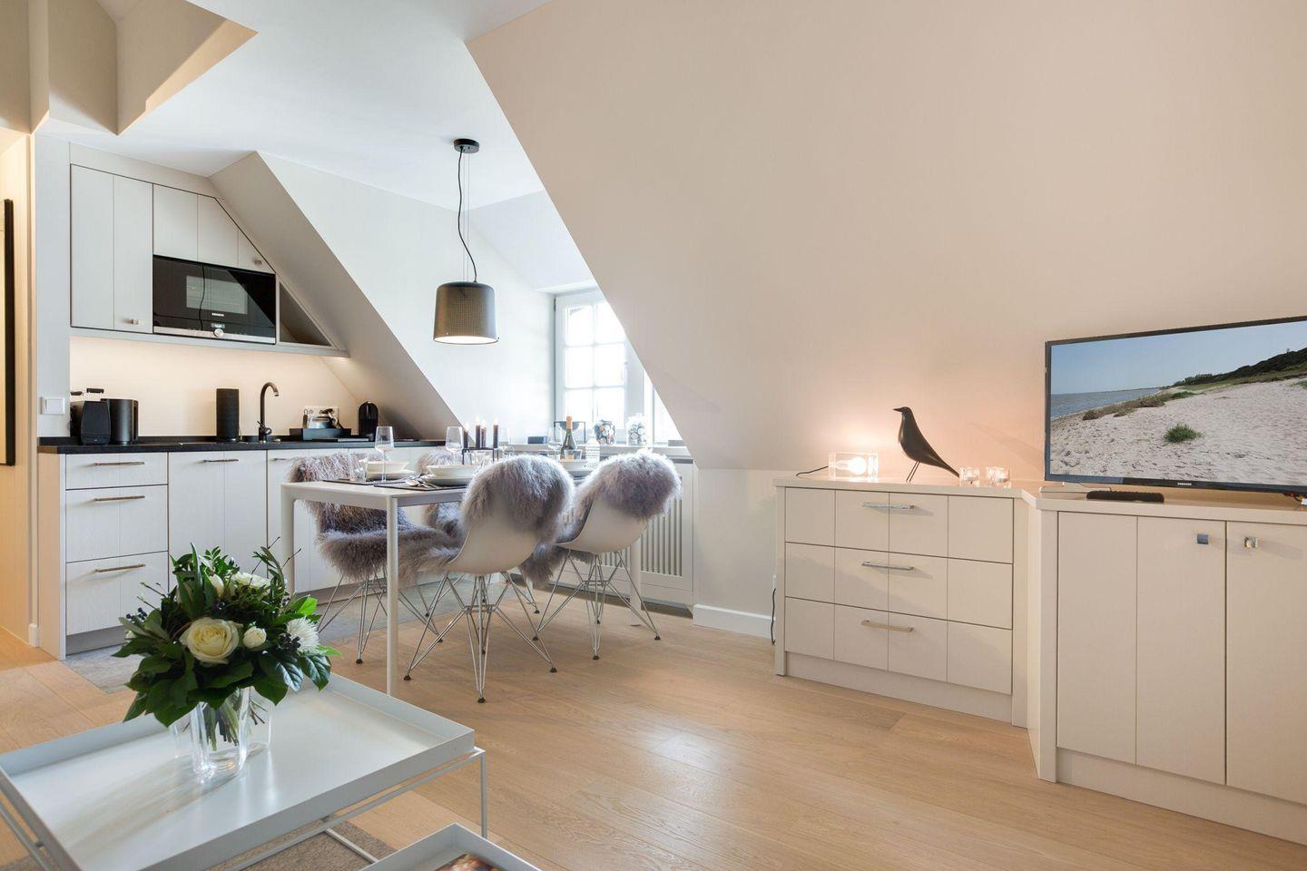Die offene, moderne Küche ist mit Cerankochfeld und Nespresso-Kaffeemaschine ausgestattet und bietet alles, was Sie für Ihre kulinarischen Wünsche benötigen.