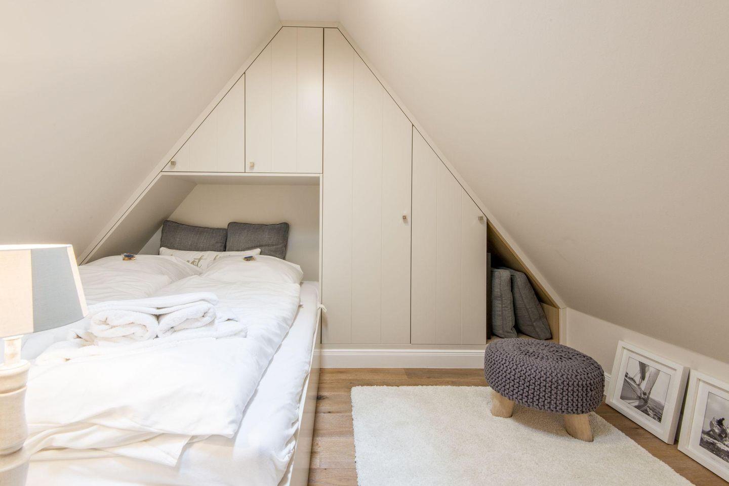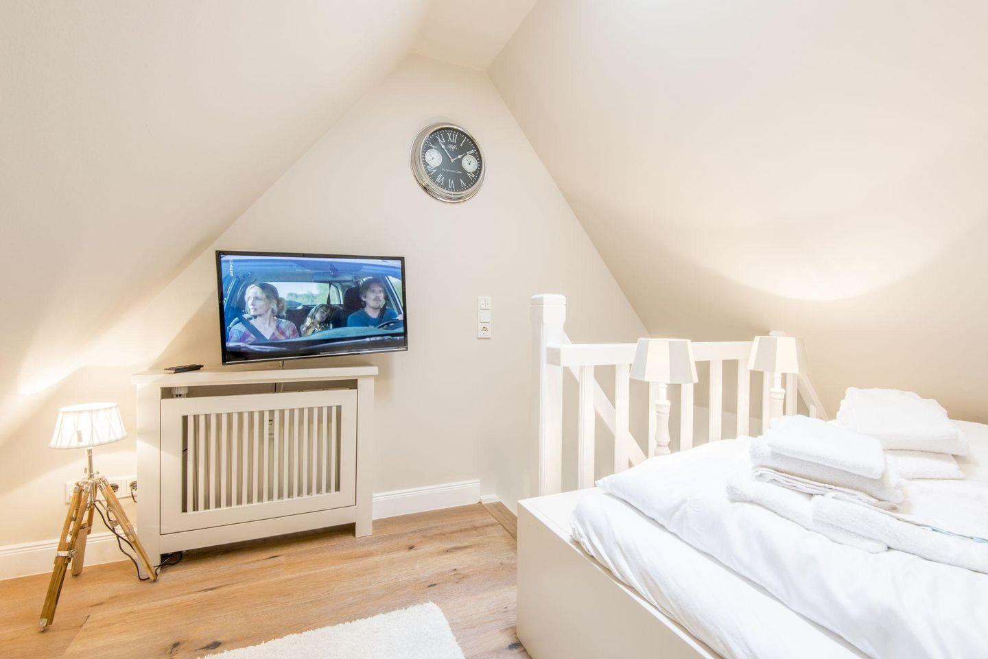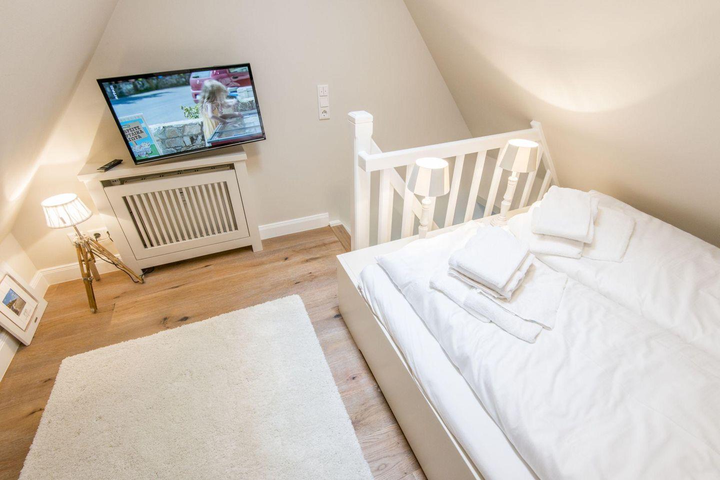 Im Dachgeschoss erwartet Sie das Schlafzimmer mit einem komfortablen Doppelbett (2 x 80x200 cm), einem geräumigen Einbauschrank und einem TV für entspannte Stunden.