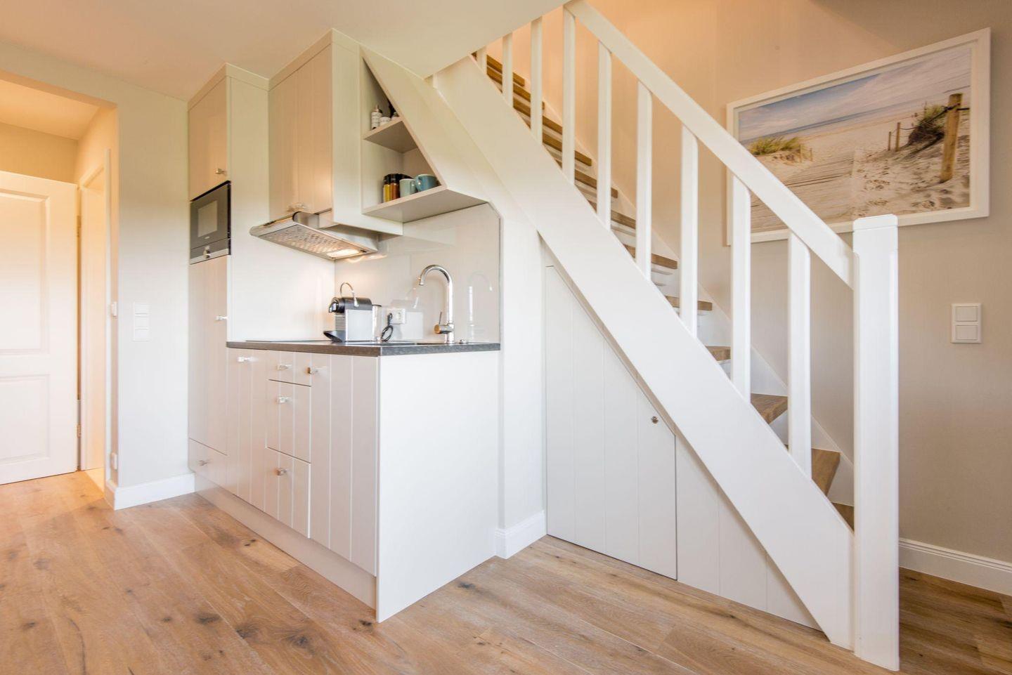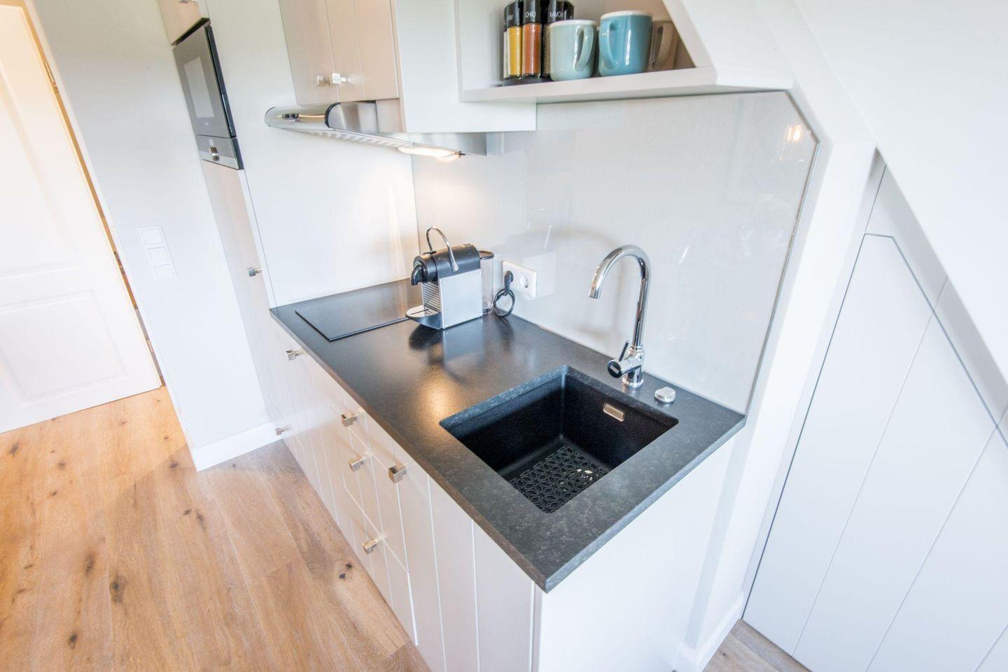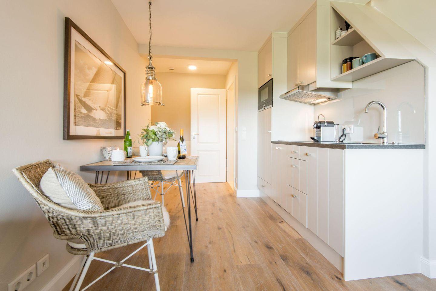 Die offene Küche ist mit einem 2er-Cerankochfeld, Mikrowelle, Geschirrspüler und Nespressomaschine ausgestattet und bietet alles, was Sie für entspannte Mahlzeiten benötigen.