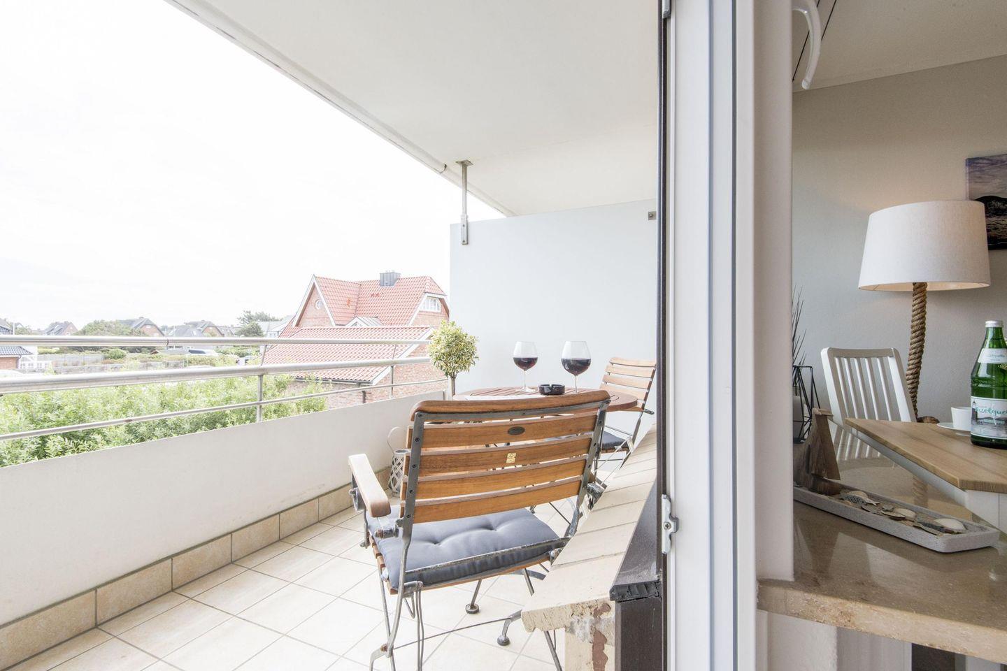 Der Wohn-/Schlafbereich ist mit einem komfortablen Doppelbett (160x200 cm) und einem TV ausgestattet, sodass Sie sich nach einem erlebnisreichen Tag entspannen können. Die gemütliche Essecke bietet Platz für zwei Personen, um gemeinsam zu speisen oder einen Kaffee zu genießen. Vom Wohnbereich aus haben Sie direkten Zugang zum Ostbalkon, auf dem Sie den Sonnenaufgang und die frische Nordseeluft genießen können.