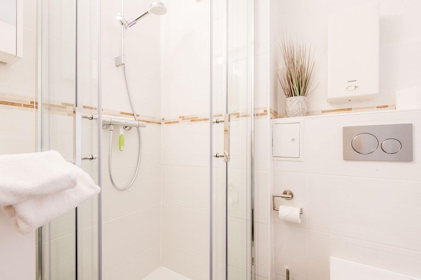 Das moderne Badezimmer verfügt über eine Dusche und ein WC. Die moderne Ausstattung bietet Ihnen alles, was Sie für einen entspannten Start in den Tag oder zur Erfrischung nach einem langen Strandtag benötigen.