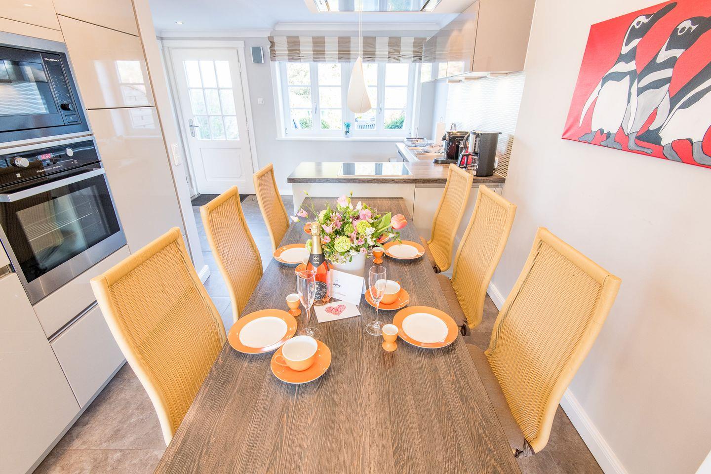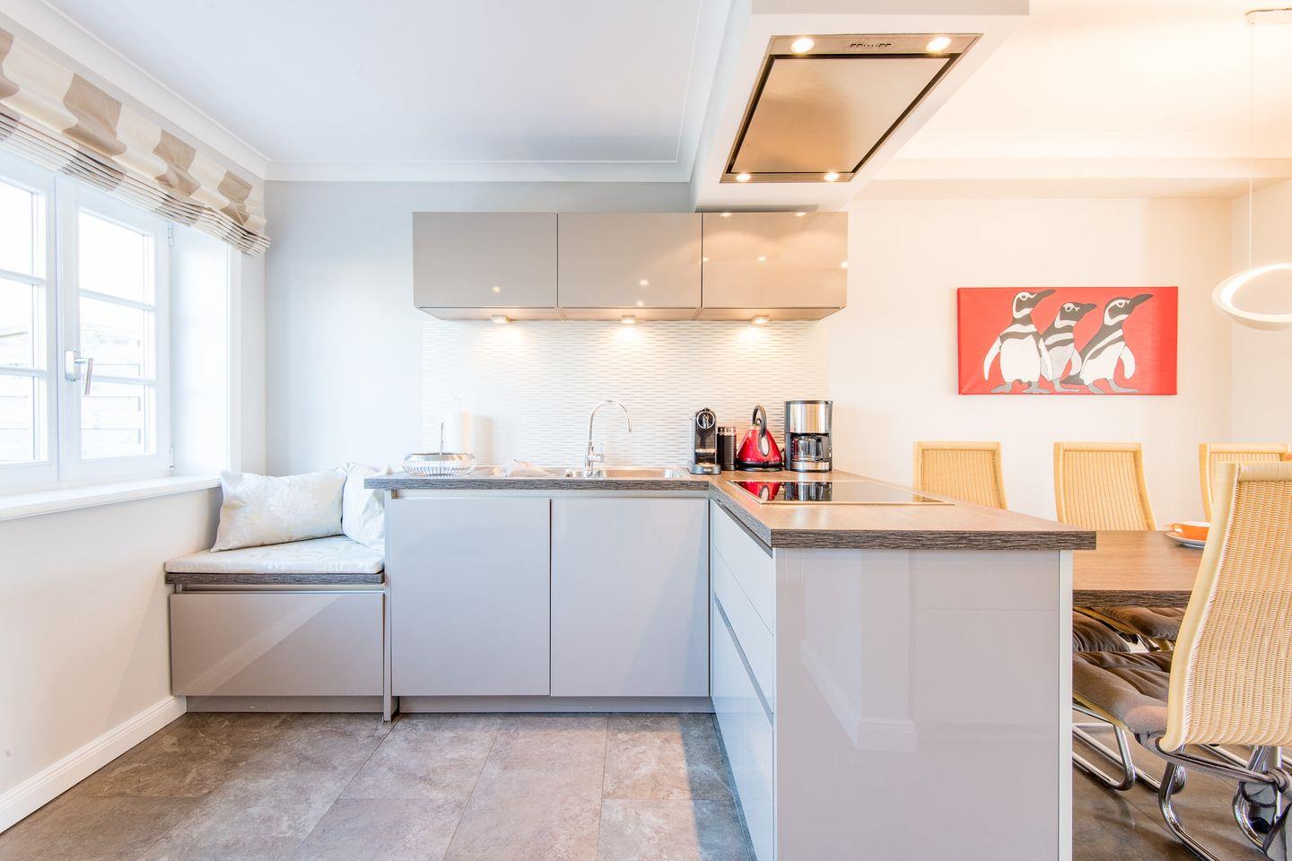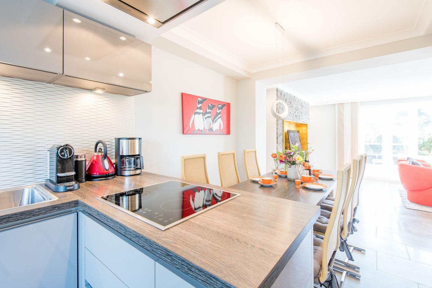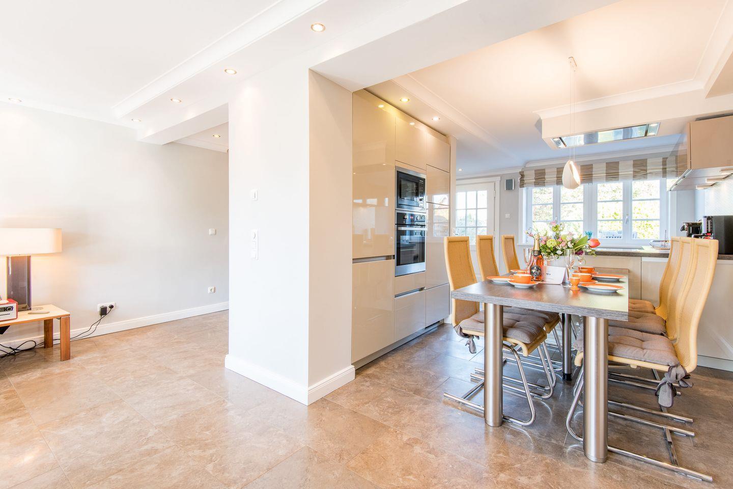 Die moderne, offene Küche ist bestens ausgestattet, inklusive Geschirrspüler, Backofen und reichlich Stauraum für all Ihre Vorräte. Sie schließt sich direkt an den Essbereich an, der ideal für gesellige Mahlzeiten ist und direkten Zugang zur Terrasse und dem kleinen Gartenbereich bietet.