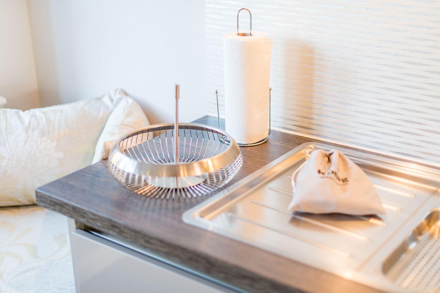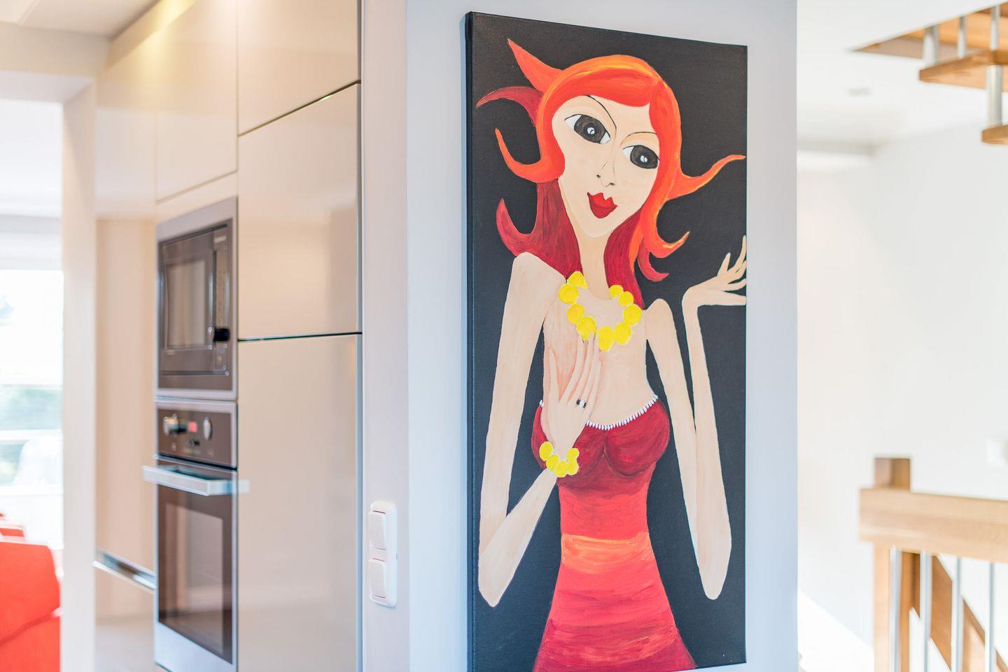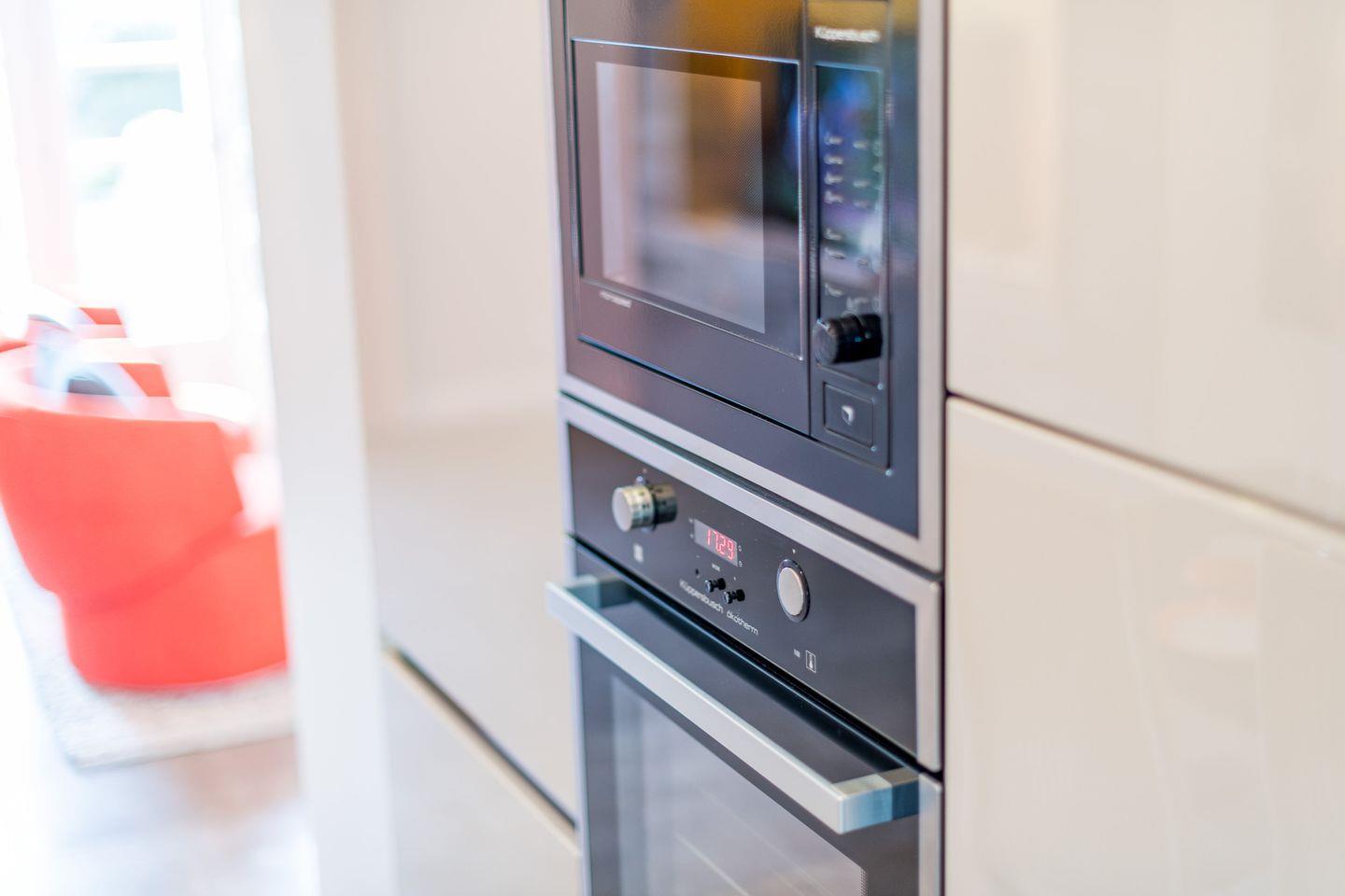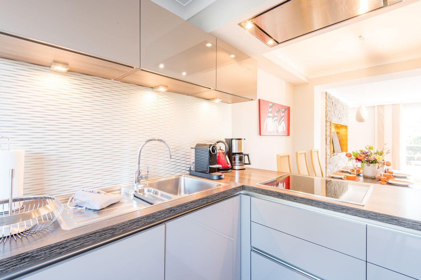 Die moderne, offene Küche ist bestens ausgestattet, inklusive Geschirrspüler, Backofen und reichlich Stauraum für all Ihre Vorräte. Sie schließt sich direkt an den Essbereich an, der ideal für gesellige Mahlzeiten ist und direkten Zugang zur Terrasse und dem kleinen Gartenbereich bietet.
