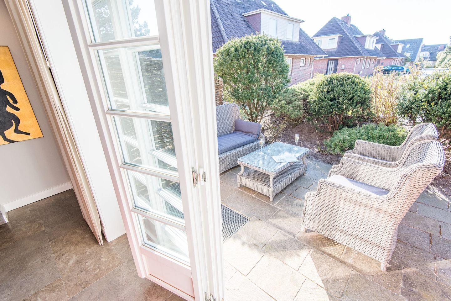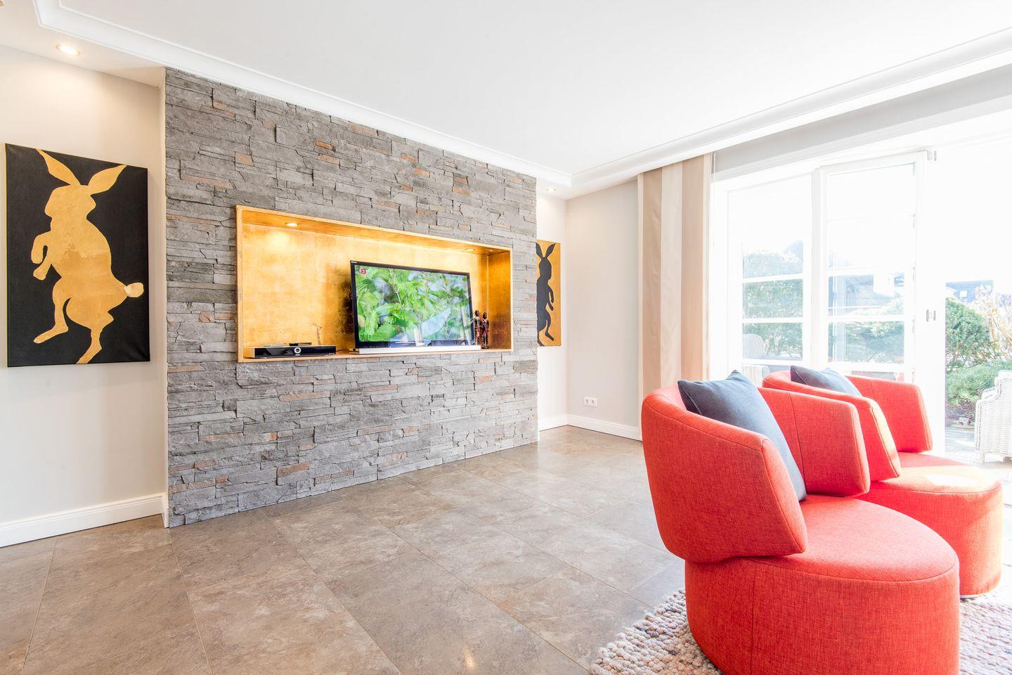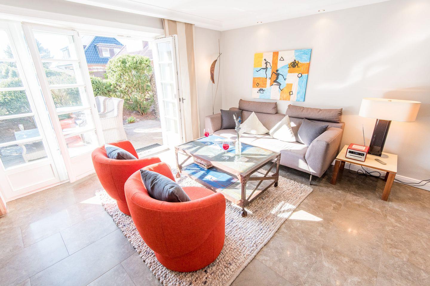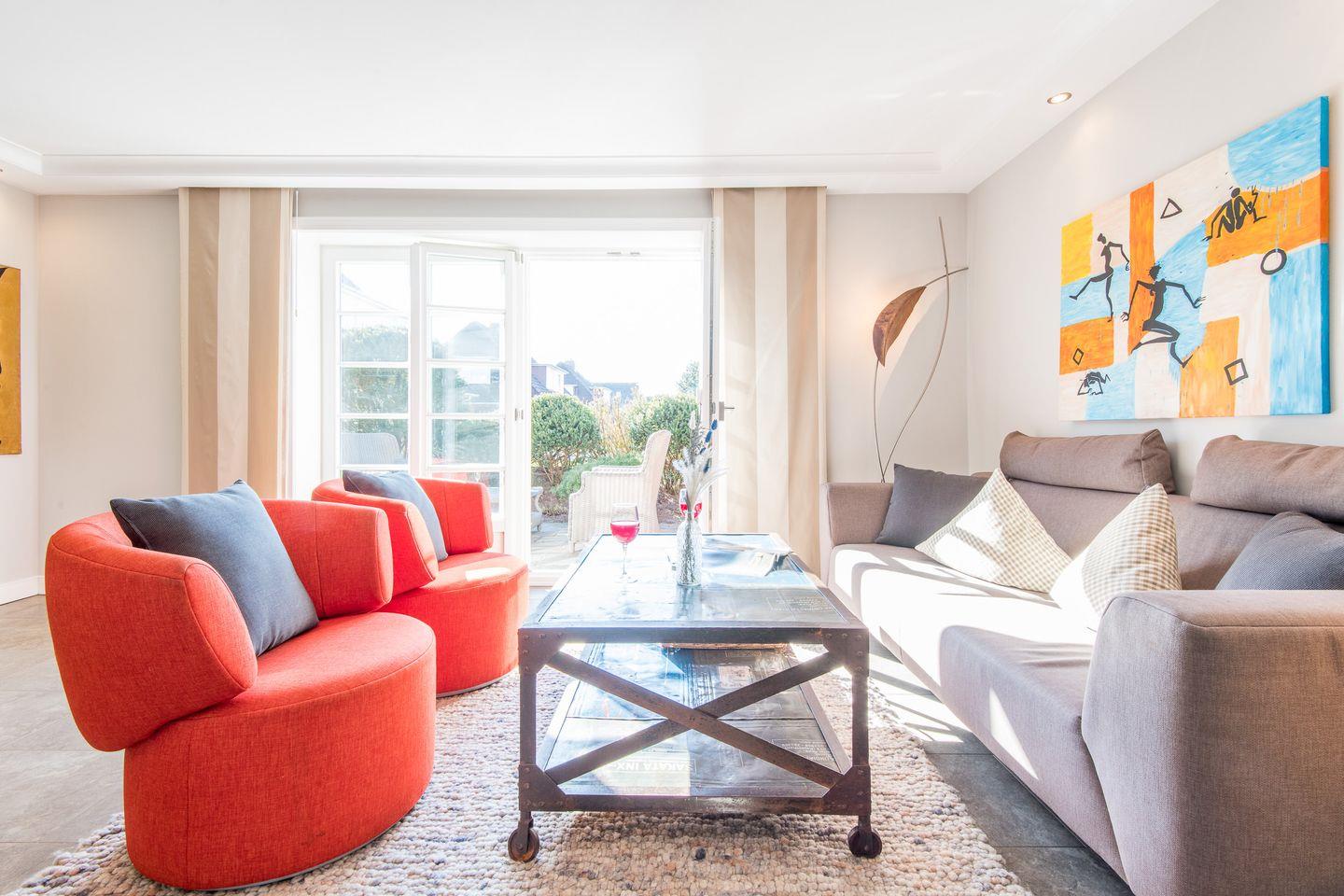 Das großzügige Wohnzimmer lädt mit einem bequemen Sofa, gemütlichen Sesseln und einem großen TV zum Entspannen ein. Die stilvolle Einrichtung und das helle Ambiente schaffen eine besonders einladende Atmosphäre. Der direkte Zugang zur windgeschützten Terrasse nach Westen ermöglicht Ihnen erholsame Stunden unter freiem Himmel und bietet einen herrlichen Rückzugsort für sonnige Tage.