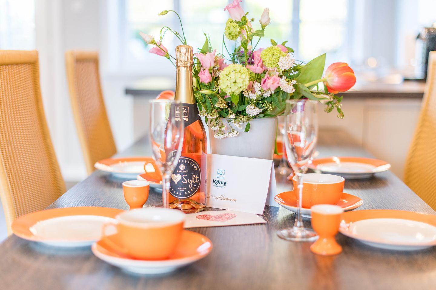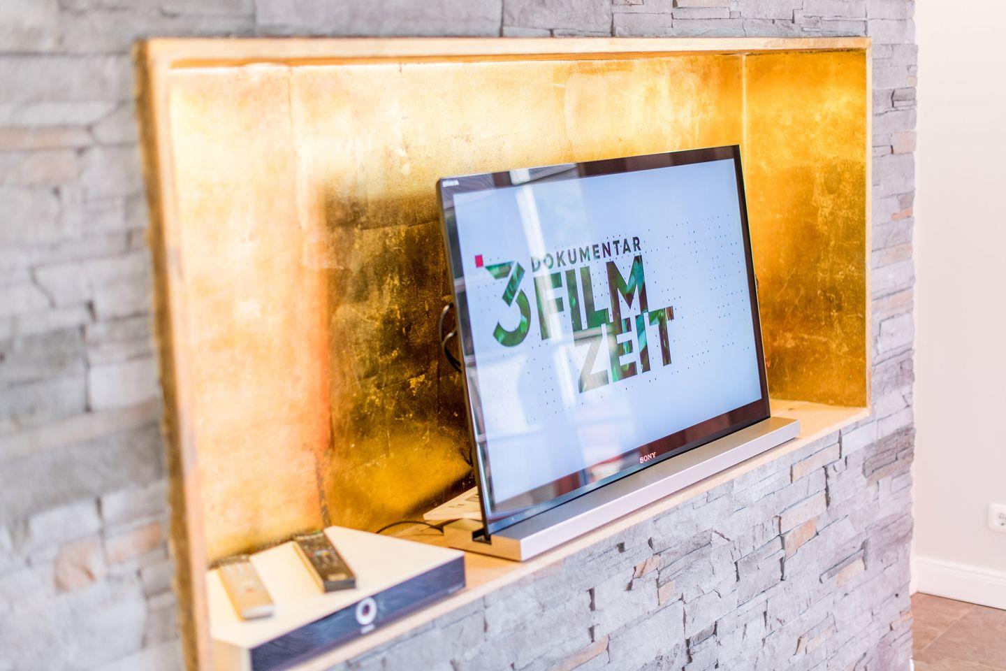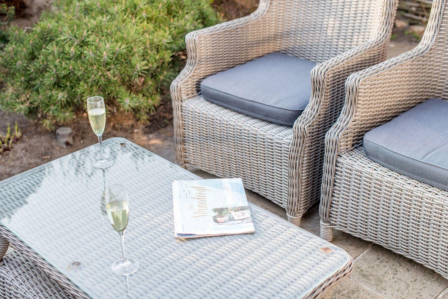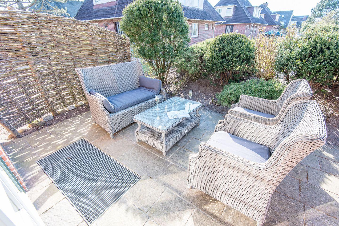 Das großzügige Wohnzimmer lädt mit einem bequemen Sofa, gemütlichen Sesseln und einem großen TV zum Entspannen ein. Die stilvolle Einrichtung und das helle Ambiente schaffen eine besonders einladende Atmosphäre. Der direkte Zugang zur windgeschützten Terrasse nach Westen ermöglicht Ihnen erholsame Stunden unter freiem Himmel und bietet einen herrlichen Rückzugsort für sonnige Tage.