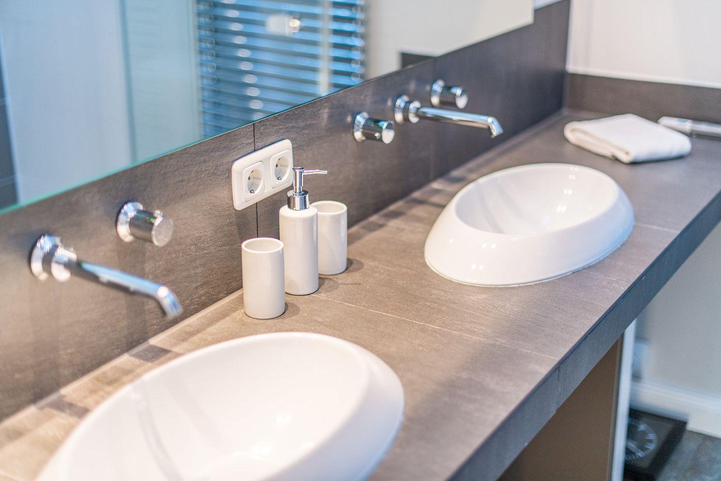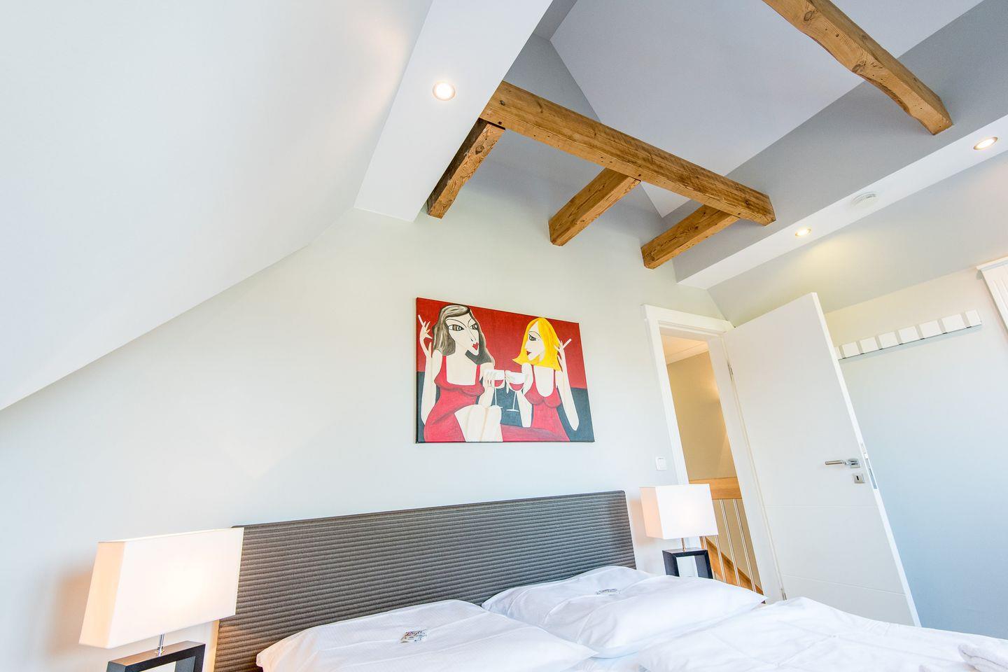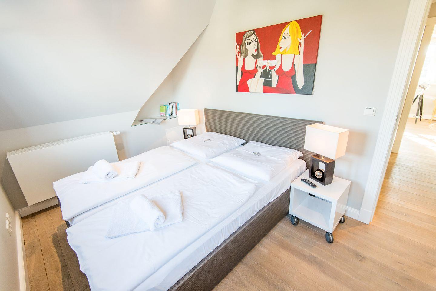 Die beiden geschmackvoll eingerichteten Schlafzimmer sorgen für erholsame Nächte: Das Hauptschlafzimmer verfügt über ein großes Doppelbett (2x 90x200 cm), TV und geräumige Einbauschränke, die viel Platz für Ihre Garderobe bieten. Das zweite Schlafzimmer ist mit einem Doppelbett (2x 80x200 cm) ausgestattet und bietet ebenfalls einen TV und Einbauschrank – ideal für zusätzlichen Komfort und Privatsphäre.