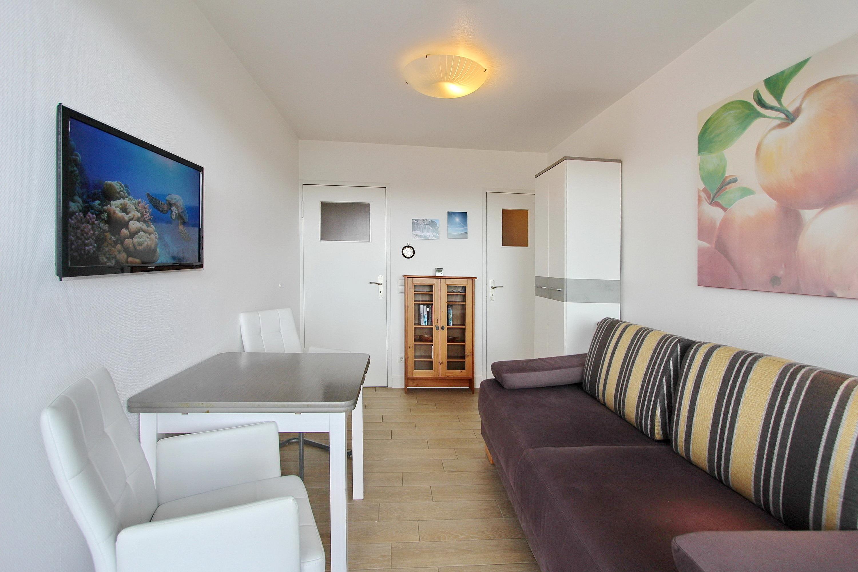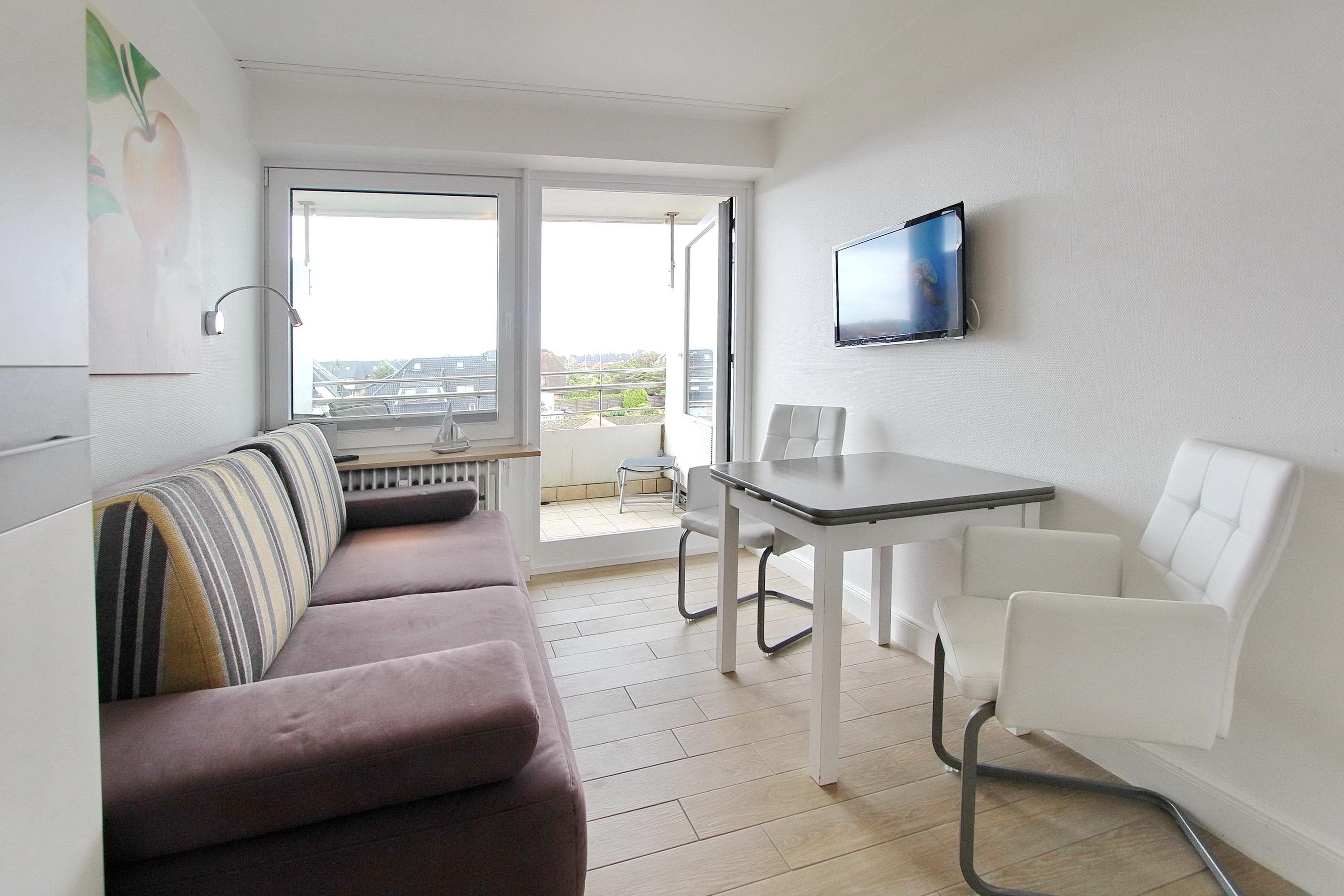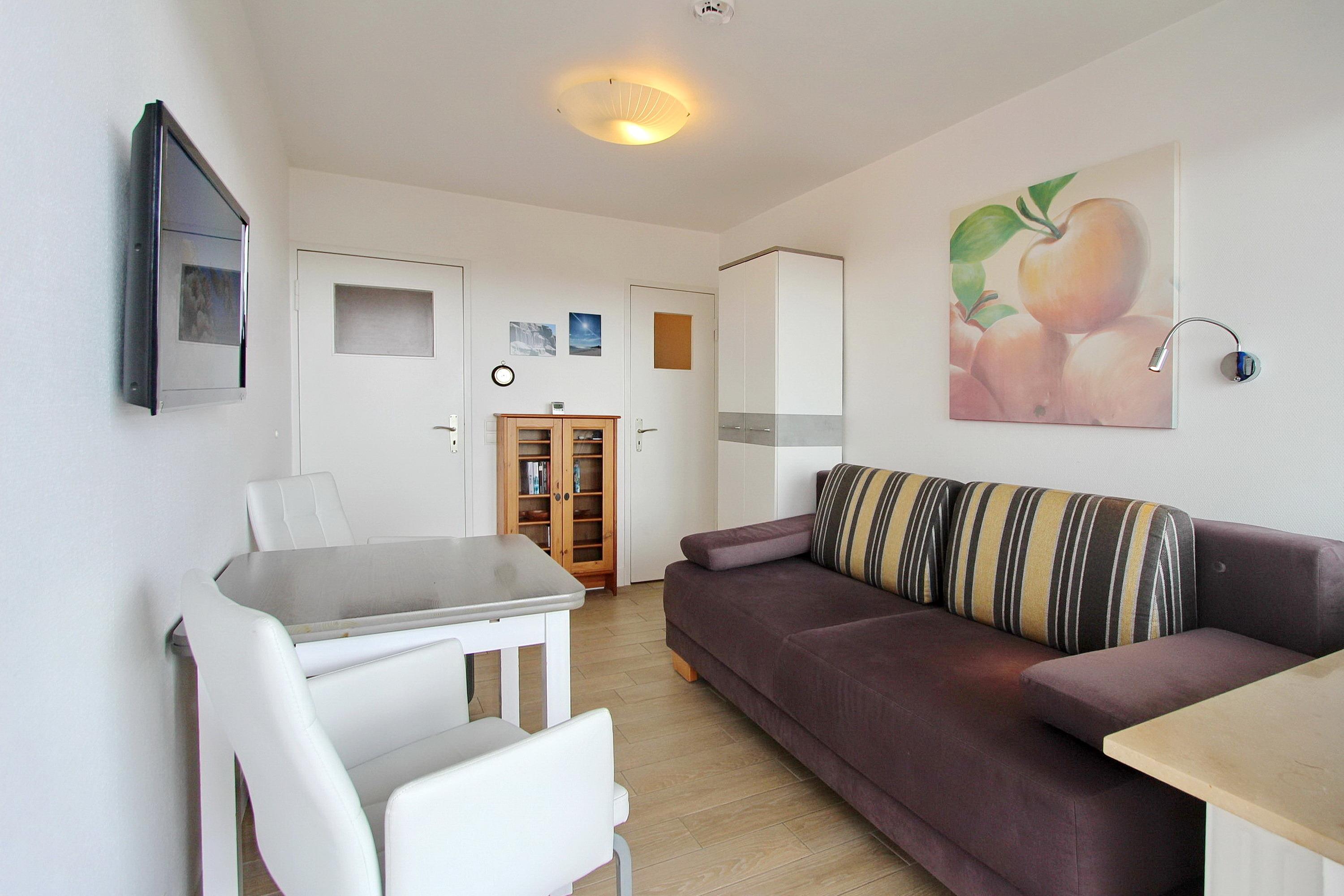 Diese hell und freundlich eingerichtete 1 Zimmer Wohnung in der 2. Etage im Dünenhof zum Kronprinzen zur Landseite liegt nur wenige Schritte vom Strand und Meer entfernt. Der liebevoll, neu renovierte Wohn-/Schlafraum mit vorgelagertem Ostbalkon verfügt über eine bequeme Schlafcouch mit Lattenrost. Am gemütlichen Essplatz für 2 Personen können sie die täglichen Mahlzeiten einnehmen oder auch einen Spieleabend verbringen. Das Badezimmer ist mit Dusche und beheiztem Handtuchtrockner ausgestattet. Die moderne Einbauküche im Flur verfügt über eine Mikrowelle. Ein Flachbildfernseher rundet das Angebot dieser kleinen aber feinen Nichtraucherwohnung ab. Ein freier WLAN Hotspot (Duenenhof zum Kronprinzen – Passwort im Appartemet - ohne Gewähr) steht ihnen kostenfrei zur Verfügung. Wohnungsgröße: ca. 23 m².