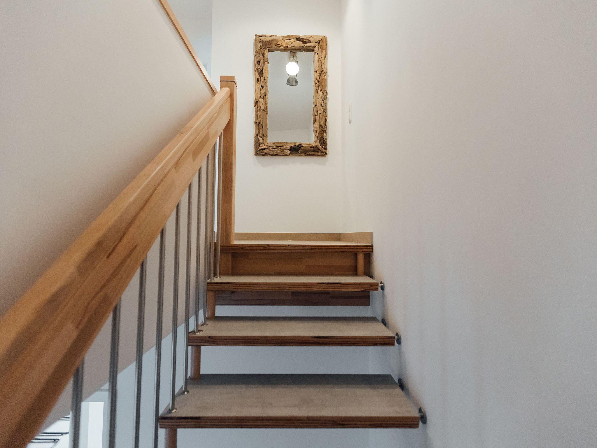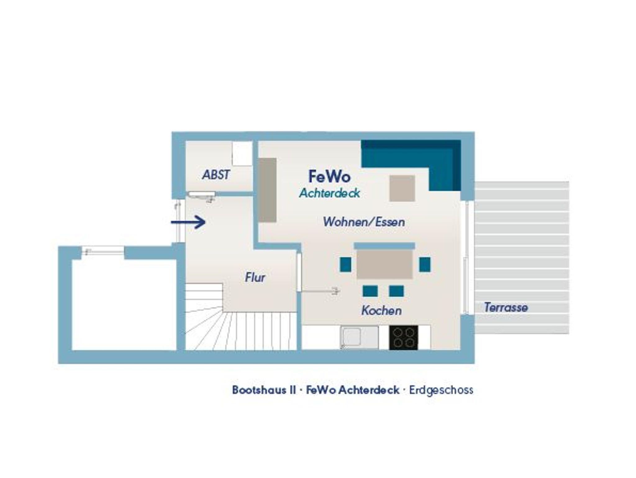 Die Ferienwohnung Achterdeck bietet Platz für bis zu sechs Personen. Sie ist auf zwei Etagen aufgeteilt. Im Erdgeschoss gibt es einen offenen Wohn- und Küchenbereich mit Essplatz und Zugang zur Terrasse. In der oberen Etage befindet sich ein separates Schlafzimmer mit einem Doppelbett sowie ein zweites separates Schlafzimmer mit einem Doppelbett und einem Etagenbett, das zwei Meter lang ist und in dem auch Erwachsene schlafen können. In der oberen Etage gibt es zudem das Badezimmer mit Dusche und WC. Zur Ferienwohnung gehört ein Balkon. Die Betten des Etagenbettes haben jeweils eine Größe von 80x200 cm.