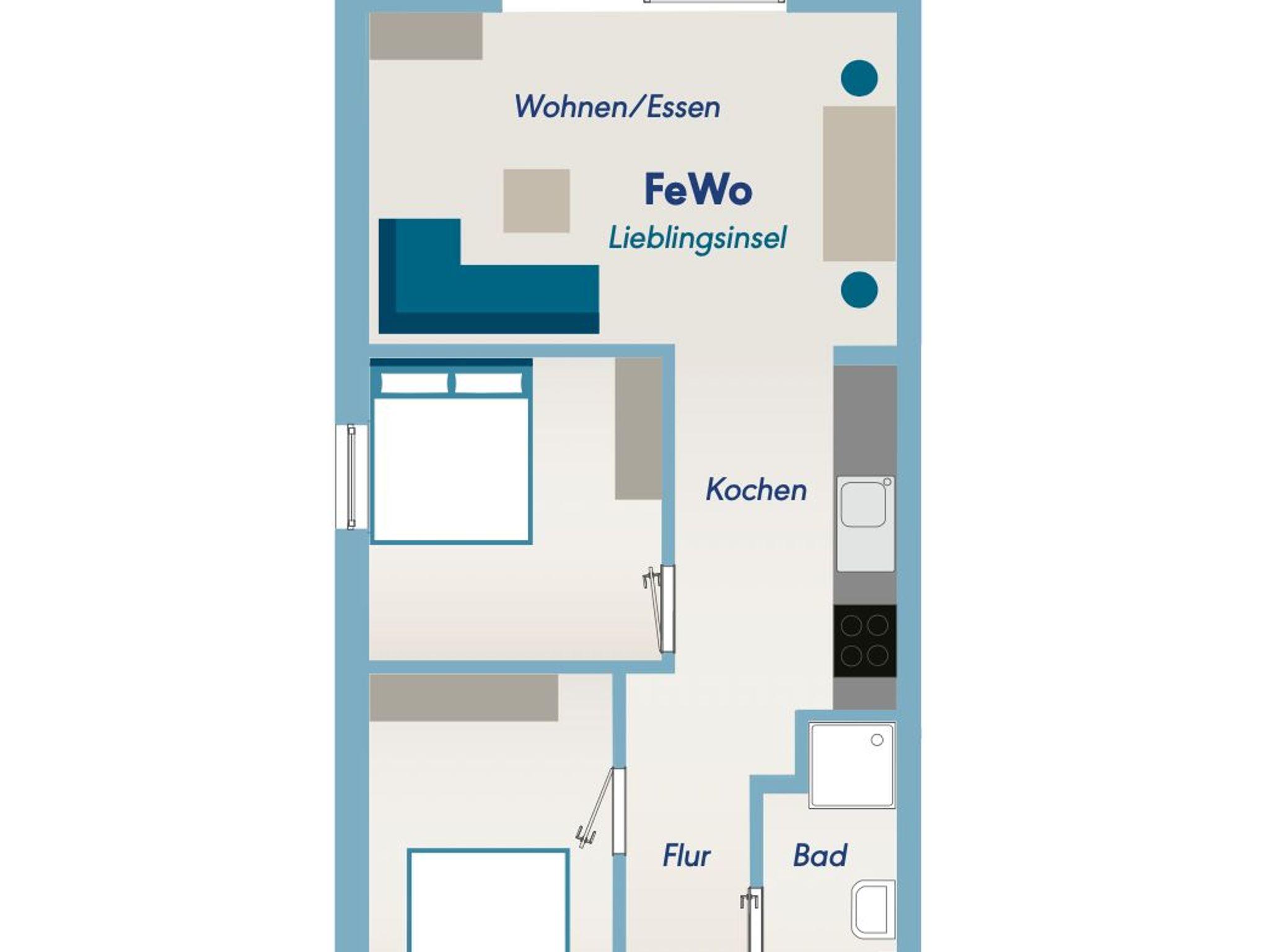 Die Ferienwohung Inseltraum bietet Platz für bis zu 4 Personen. Neben einem offenen Wohn- und Küchenbereich mit Essplatz und moderner Küchenzeile, gibt es zwei separate Schlafzimmer mit jeweils einem Doppelbett. Das Badezimmer ist mit Dusche und WC ausgestattet. Zur Ferienwohnung gehört ein Balkon. Alle Einzelbetten haben jeweils eine Größe von 80x200 cm.
