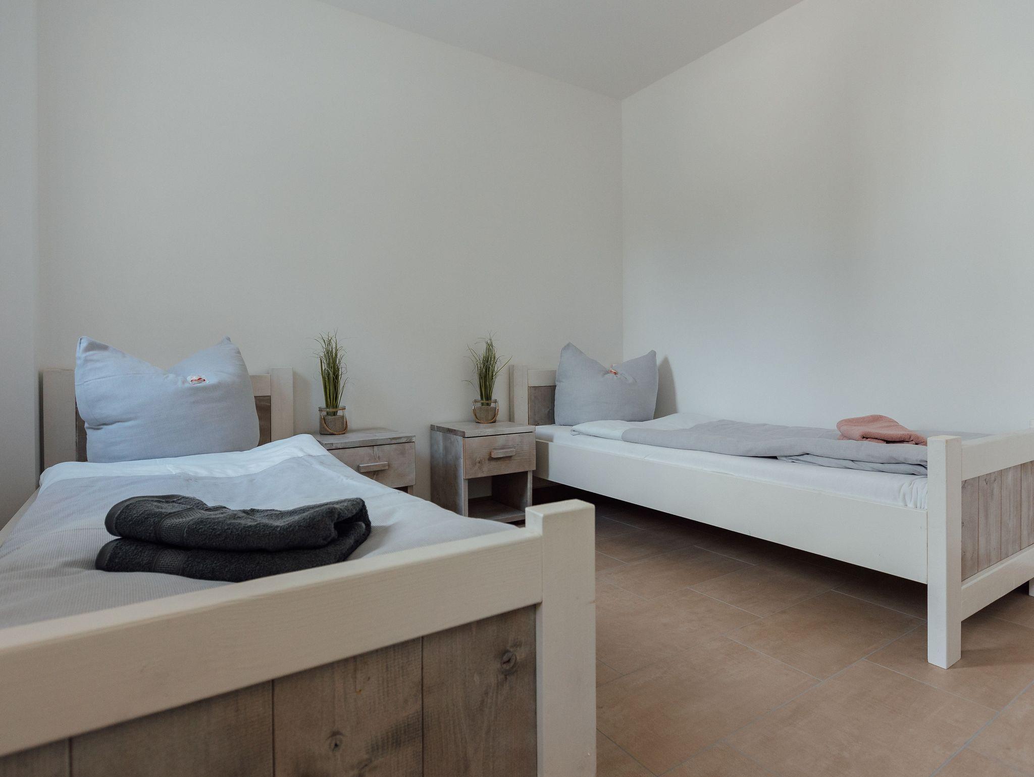 Die Ferienwohnung Havelbucht bietet Platz für bis zu vier Personen. Sie ist auf zwei Etagen aufgeteilt. Im Erdgeschoss gibt es einen offenen Wohn- und Küchenbereich mit Essplatz und Zugang zur Terrasse. In der oberen Etage befinden sich ein Schlafzimmer mit Doppelbett, ein Schlafzimmer mit zwei EInzelbetten und ein Badezimmer mit Dusche und WC. Alle Einzelbetten haben jeweils eine Größe von 80x200 cm.