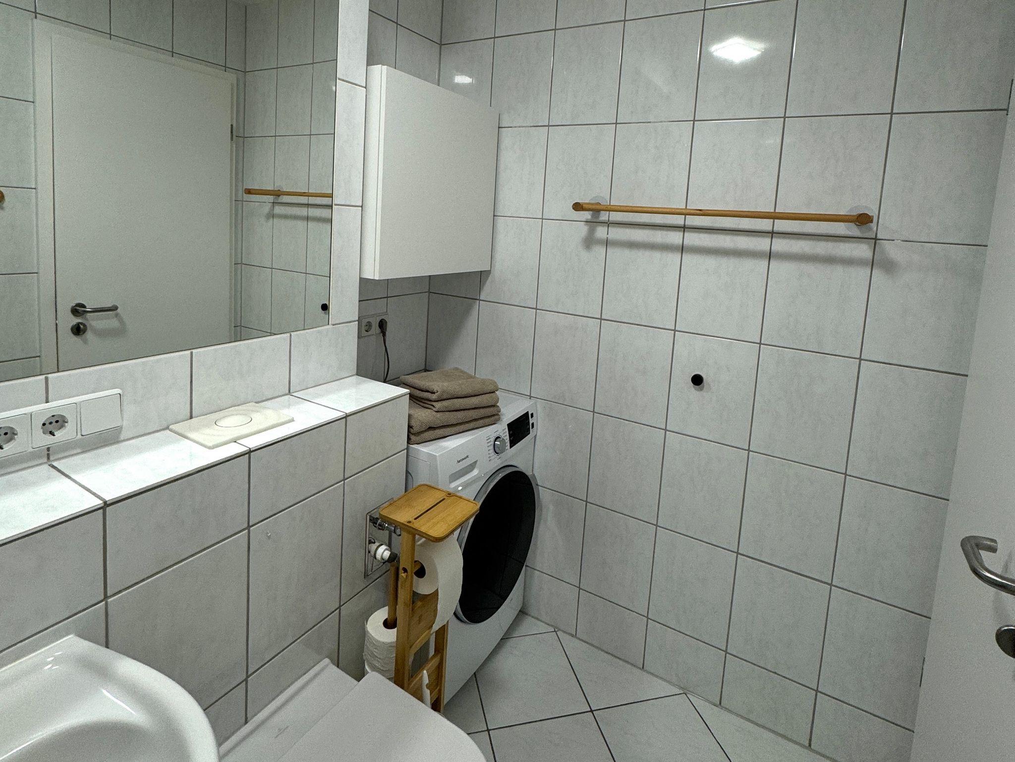 Im Badezimmer findet Ihr eine Badewanne mit Dusche, Pflegeprodukte, einen Föhn und die Waschmaschine.