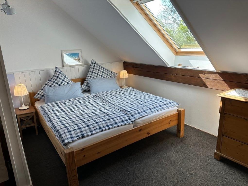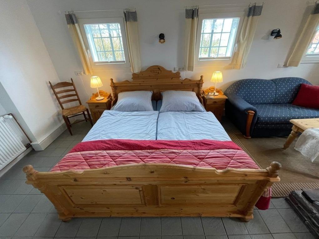 Die ca. 104 qm2 große Wohnung Störtebecker liegt im vorderen, zur Auffahrt gelegenen Teil des Hauses. Sie verfügt über ein geräumiges Schlafzimmer im Erdgeschoss und zwei weitere Schlafzimmer in der ersten Etage (1 Zimmer mit Doppelbett, 1 Zimmer mit Etagenbett 90x200cm und 90x 180cm). Das Doppelbett im ersten OG liegt in einem Raum der als Durchgangsraum zu werten ist.