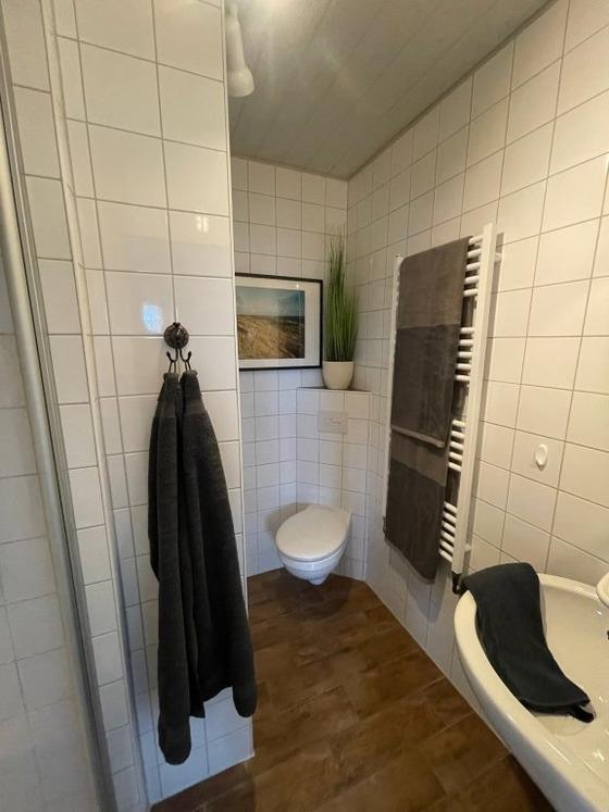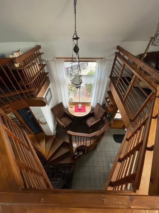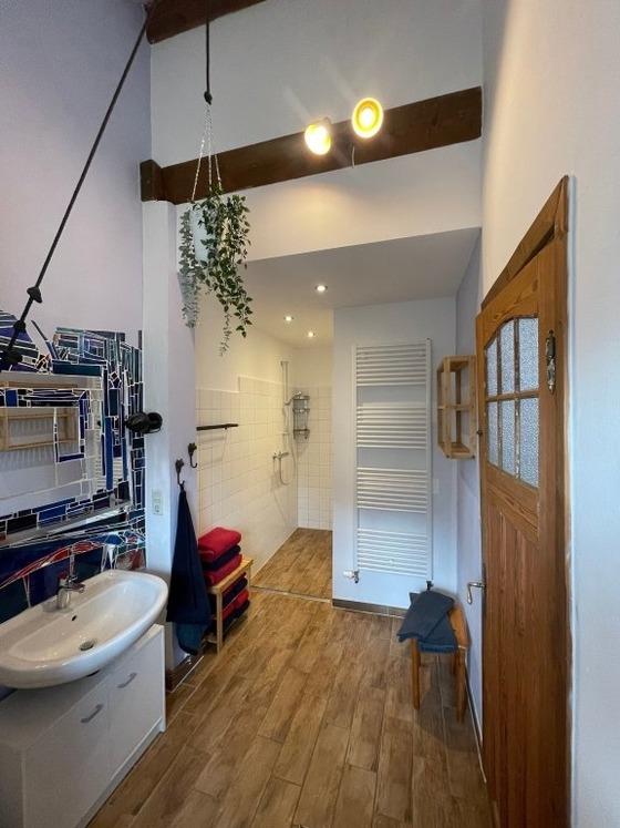 Im urigen Wohn- und Kochbereich im Erdgeschoss ist das historische Balkenkonstrukt erhalten worden. Das Zentrum der Wohnung bildet der massive Esstisch. Echte Wohlfühlatmosphäre schaffen der Kaminofen und die Empore mit Ausblick über die Wiesen und Weiden der Umgebung. Die beiden Badezimmer befinden sich ebenfalls im Erdgeschoss. Diese sind komplett modernisiert . Die Küche ist voll ausgestattet mit Kaffeemaschine, Mikrowelle, Backofen, Ceranfeld Kochstellen, Spülmaschine und Kühlschrank.