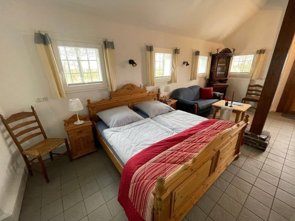 Die ca. 104 qm2 große Wohnung Störtebecker liegt im vorderenTeil des Hauses. Im urigen Wohn- und Kochbereich im Erdgeschoss ist das historische Balkenkonstrukt erhalten worden. Echte Wohlfühlatmosphäre schaffen der Kaminofen und die Empore mit Ausblick über die Wiesen und Weiden der Umgebung.