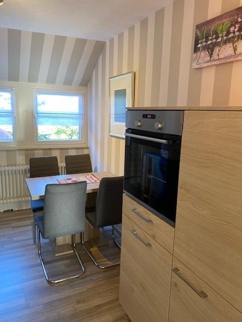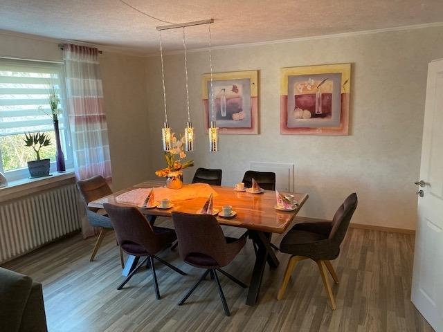 Die im Obergeschoß befindliche Ferienwohnung hat ein großes Wohnzimmer mit TV und großen Esstisch,