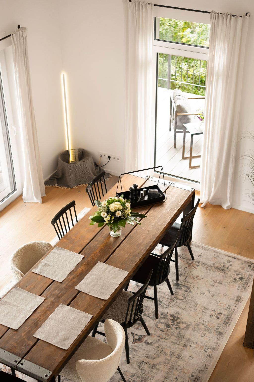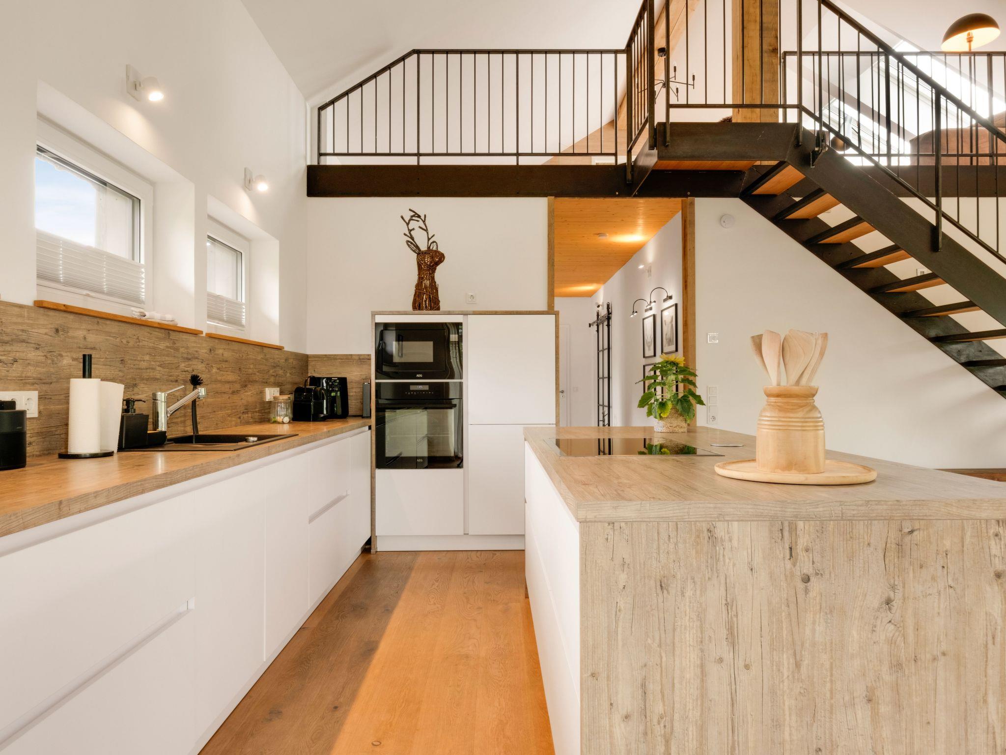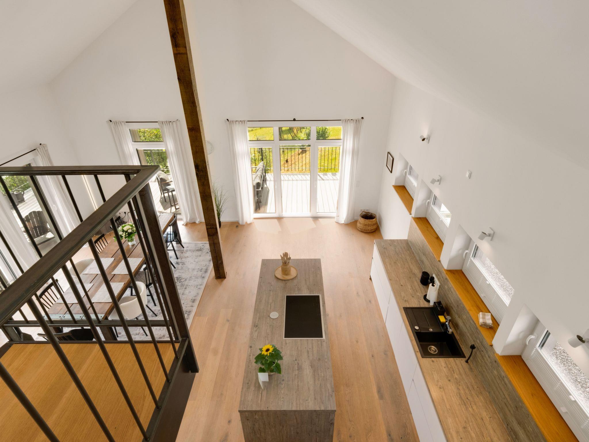 The interior of our holiday flat welcomes you with a spacious living and kitchen area that invites you to linger together. A 50-inch smart TV provides entertainment, while the fully equipped kitchen has an induction hob, filter and capsule coffee machine, kettle and dishwasher to fulfil every wish. The modern underfloor heating and the natural construction of the wooden house ensure a pleasant indoor climate all year round.