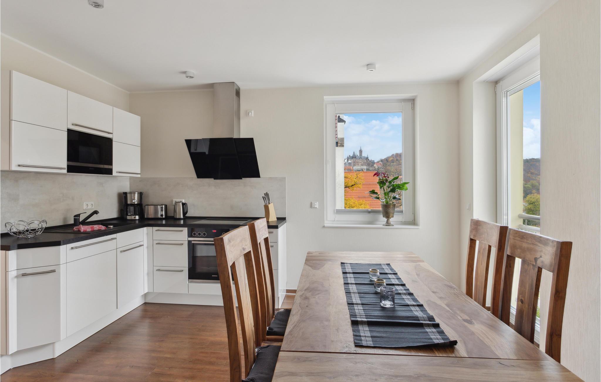 Fra køkkenet og stuen kan I gå lige ud på altanen, hvor I har en smuk udsigt over Wernigerode Slot.