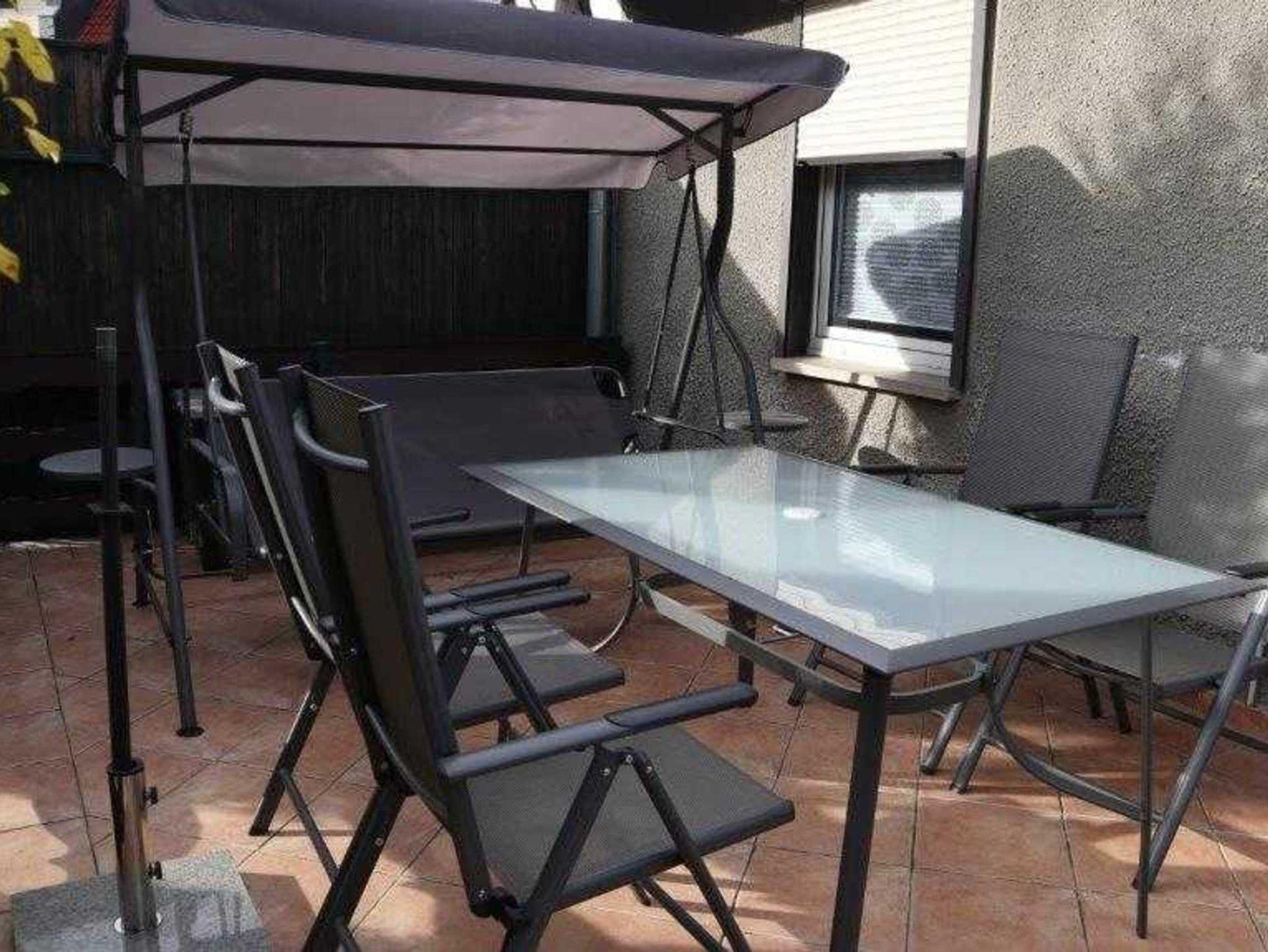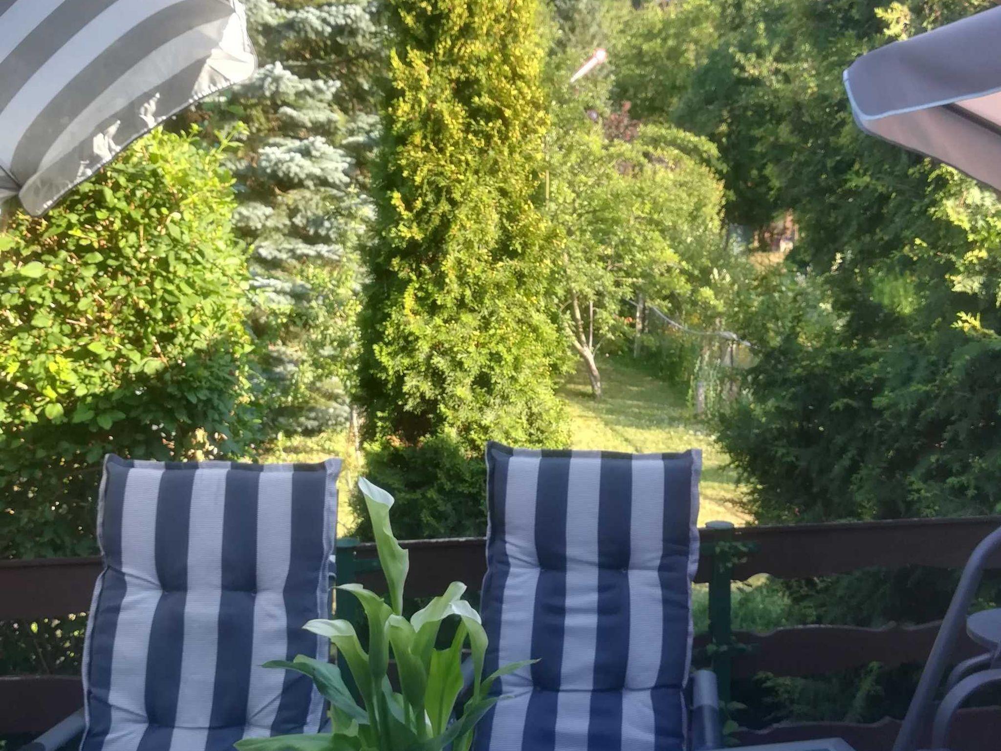 Auf der Terrasse mit Aussicht in den Garten, Tisch und Stühlen mit modernen Auflagen,einer gemütlichen Hollywoodschaukel, Sonnenschirm, Blumen und dezenter Beleuchtung können sie beim Frühstück den Tag beginnen oder einen erholsamen Abend genießen.