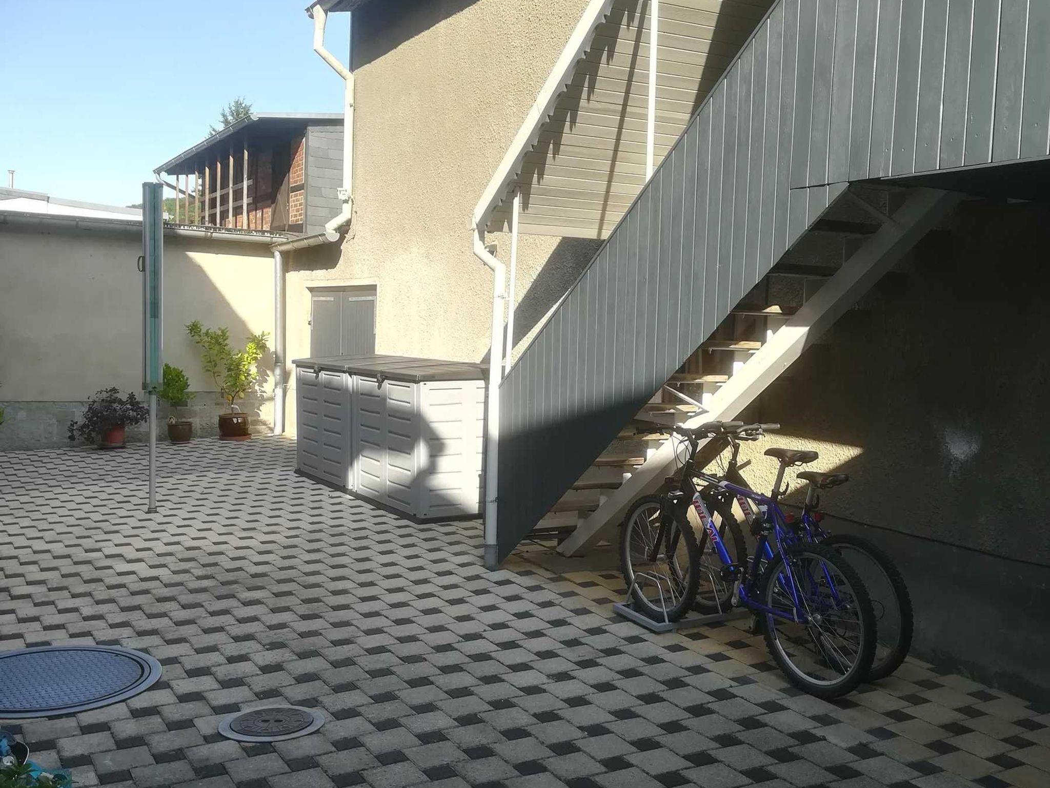 Sie verfügt über einen separaten Eingang, der gleichzeitig eine schmale Parkmöglichkeit für Ihren PKW sein kann. Weiterhin kann schräg gegenüber unseres Hauses, auf der Straße am Spielplatz geparkt werden.