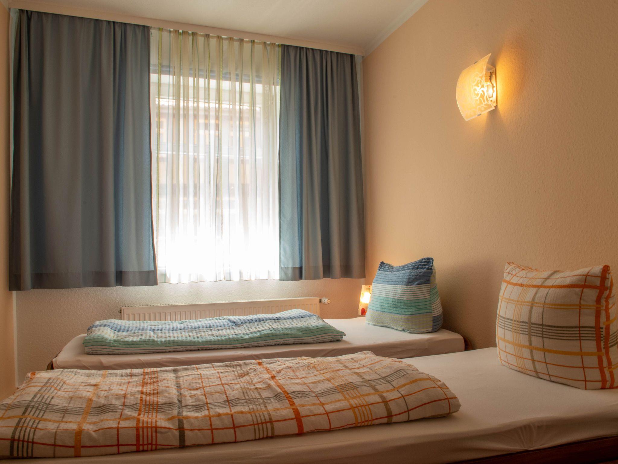Ein Schlafzimmer ist mit einem Doppelbett (1,80 m x 2,00 m) und einem großen Kleiderschrank der zweite Schlafraum mit zwei Einzelbetten (0,90 m x 2,00 m) und einem Kleiderschrank ausgestattet.