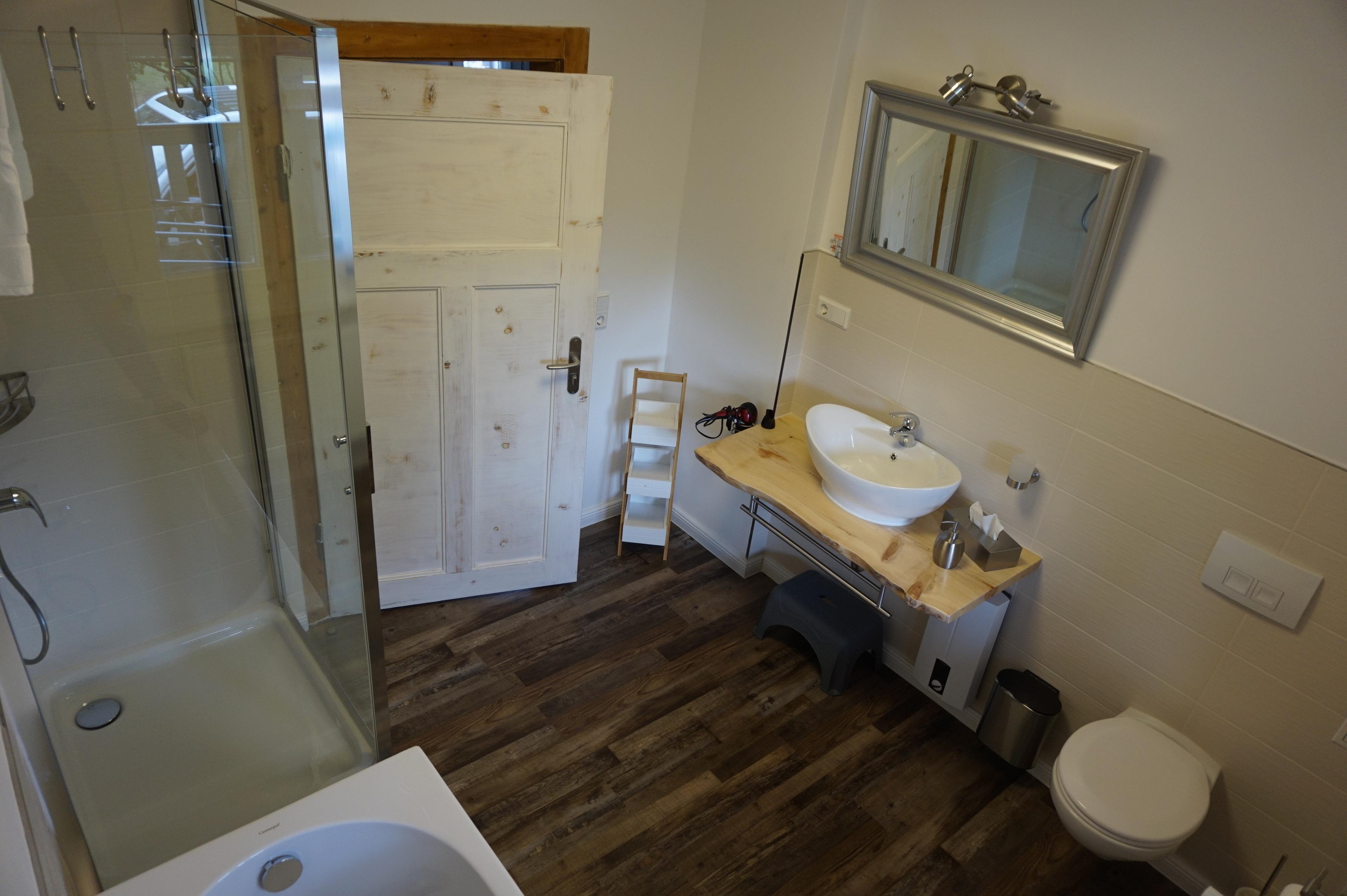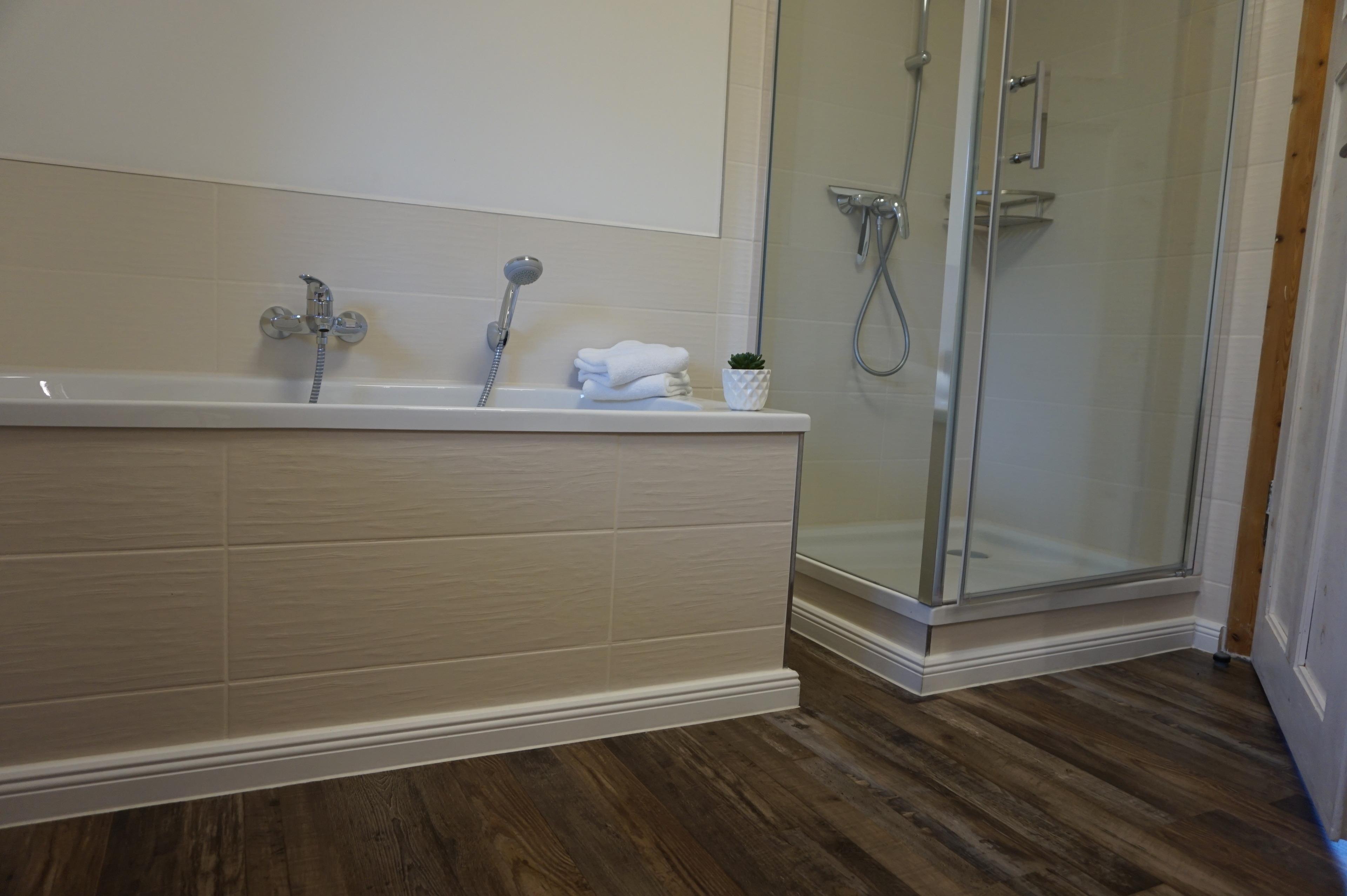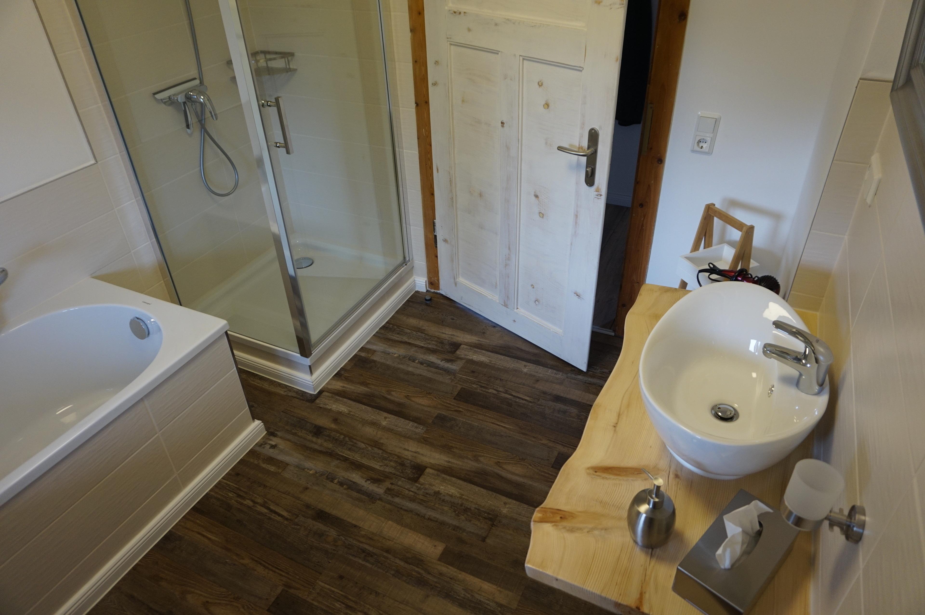 Bad mit Toilette, Waschtisch, Dusche und Badewanne