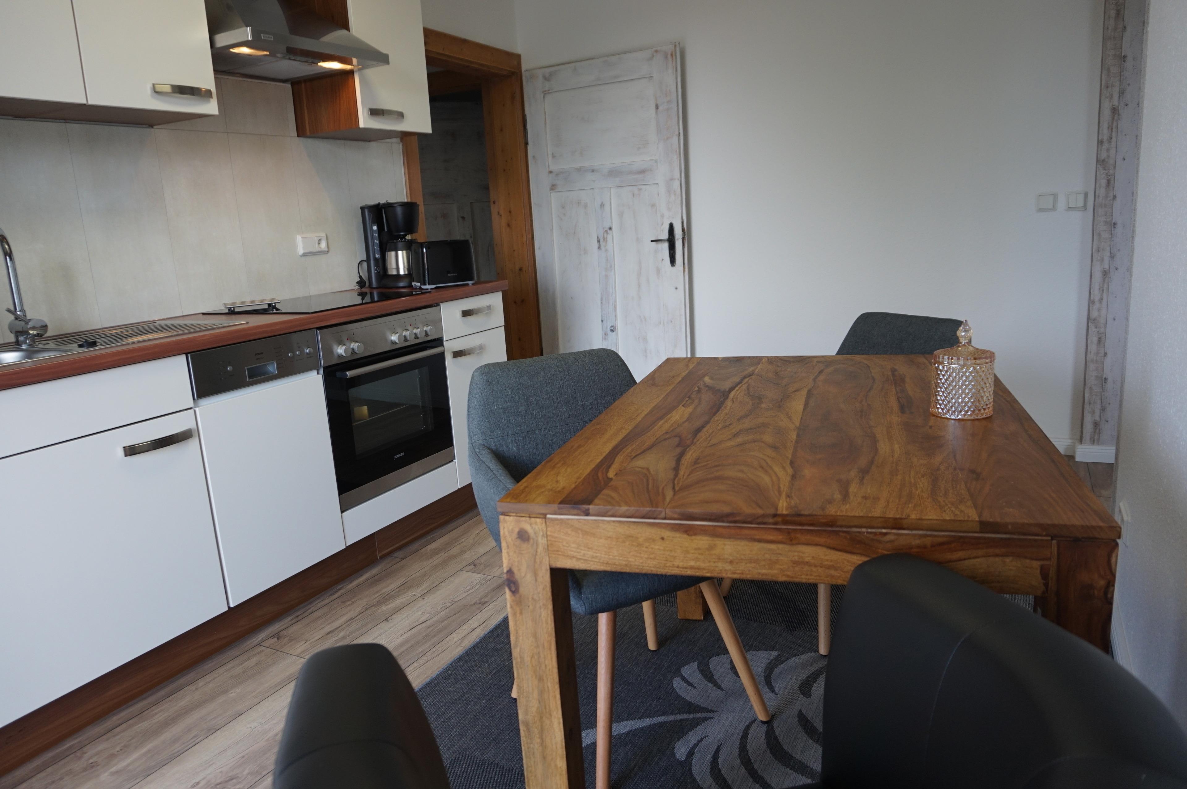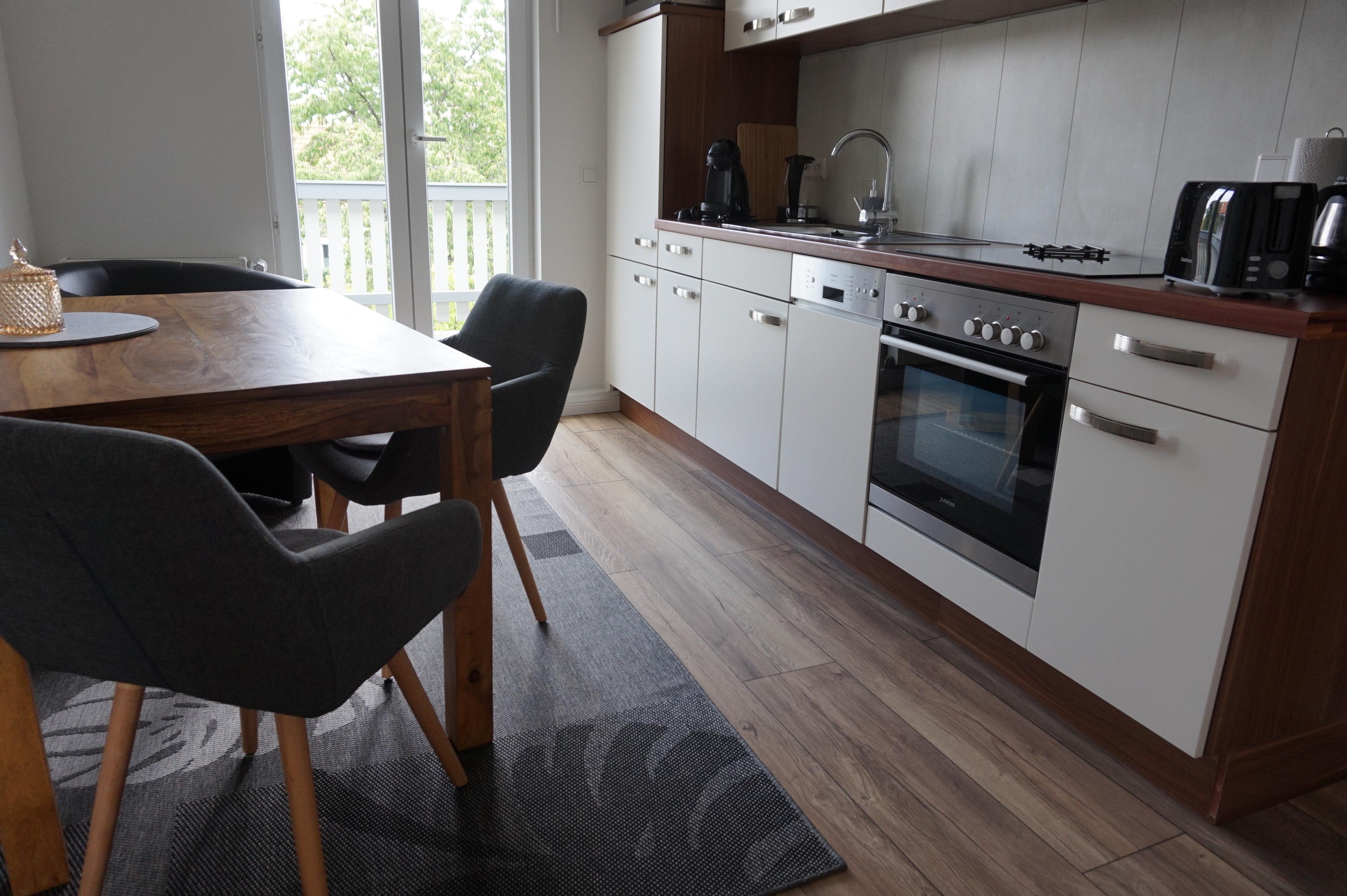 Geschirrspüler, Kaffeemaschine + Kapselmaschine, Toaster, Wasserkocher, Herd mit Backofen und Kühlschrank.