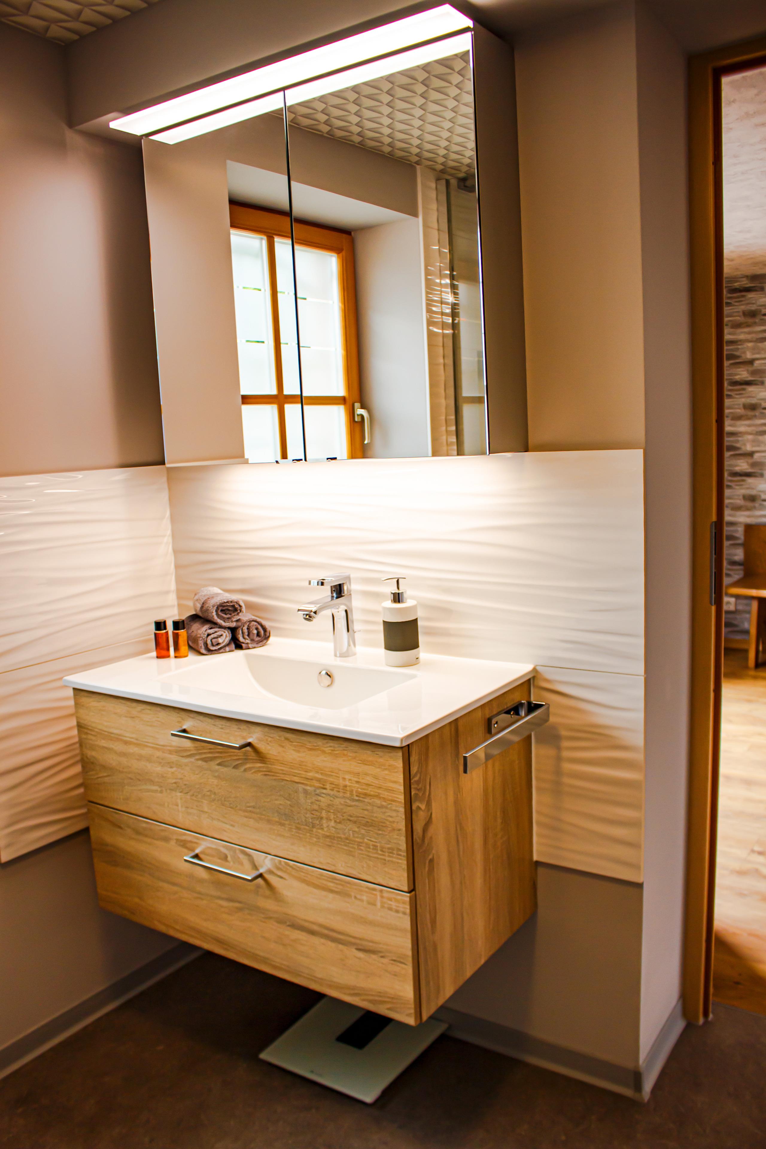 Das moderne Tageslichtbad verfügt über Dusche, Waschtisch, WC und Handtuchheizkörper.