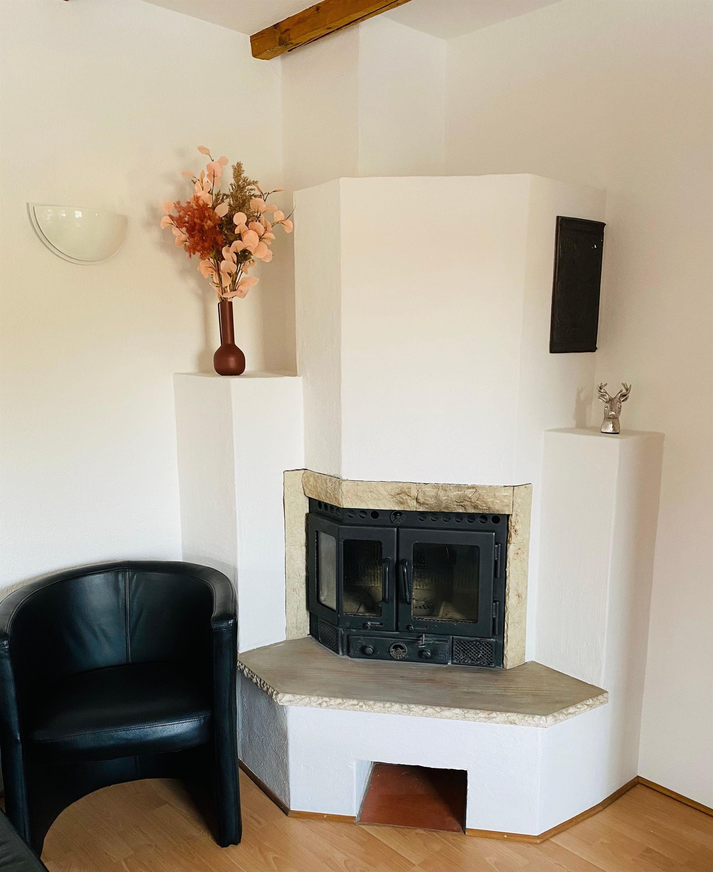 Großzügig und modern eingerichtetes Ferienhaus mit zwei Schlafzimmern und großer Wohnküche. Das geräumige, gemütliche Wohnzimmer verfügt über einen Kamin.