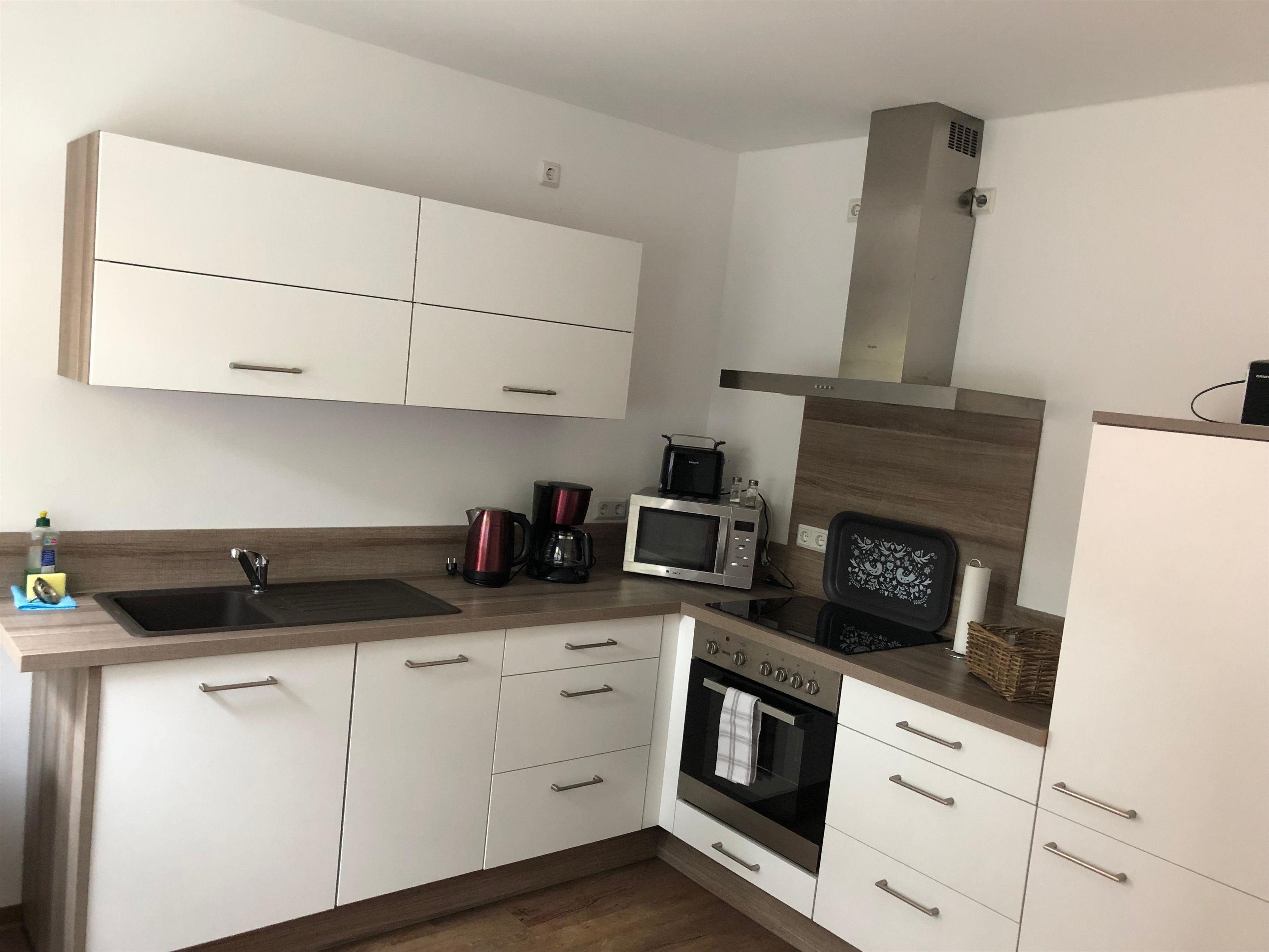 Die Küche ist komplett eingerichtet und bietet mit Backofen, 4 Platten Cerankochfeld, Kaffeemaschine, Wasserkocher, Geschirrspüler, Mikrowelle, Kühlschrank und allem notwendigen Geschirr ausreichend Komfort. Für die kleine Wäsche zwischendurch steht eine Waschmaschine Top-Lader zur Verfügung .