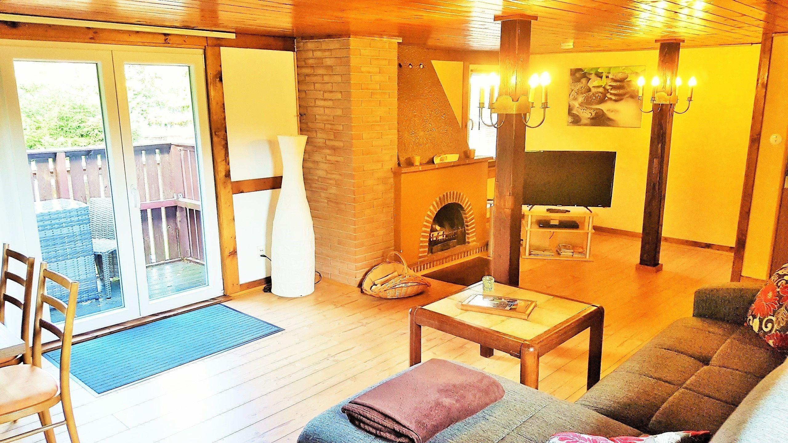 - Wohnzimmer mit Schlafcouch, Deko-Kamin, große Holzlaterne mit Kerze & Zugang zum sonnigen Balkon mit Sitzecke