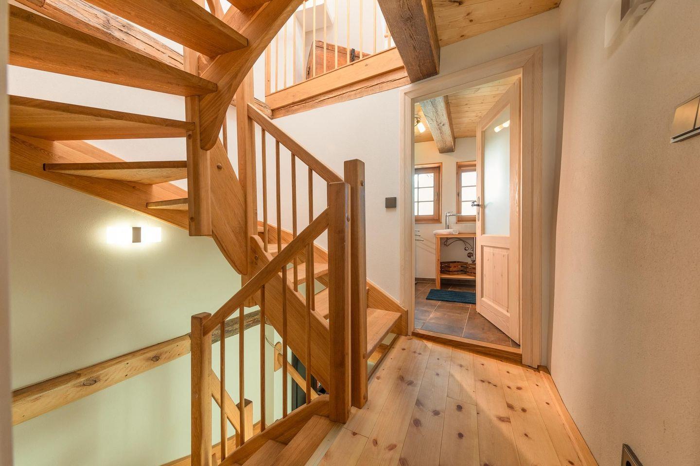 Über eine massive Echtholztreppe geht es in beiden Häusern die obere Etage. Im Haus