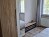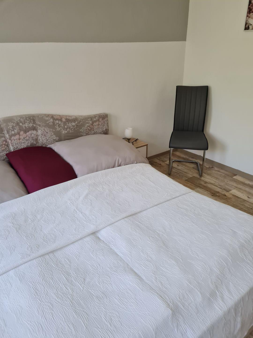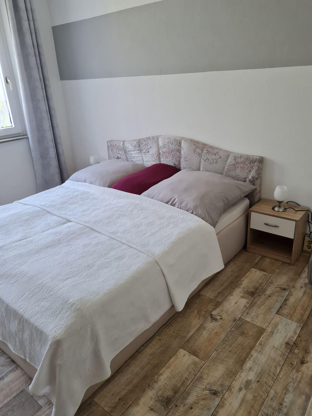 Diese modern eingerichtete Ferienwohnung verfügt über ein Schlafzimmer mit Doppelbett Kleiderschrank und einem Regal.