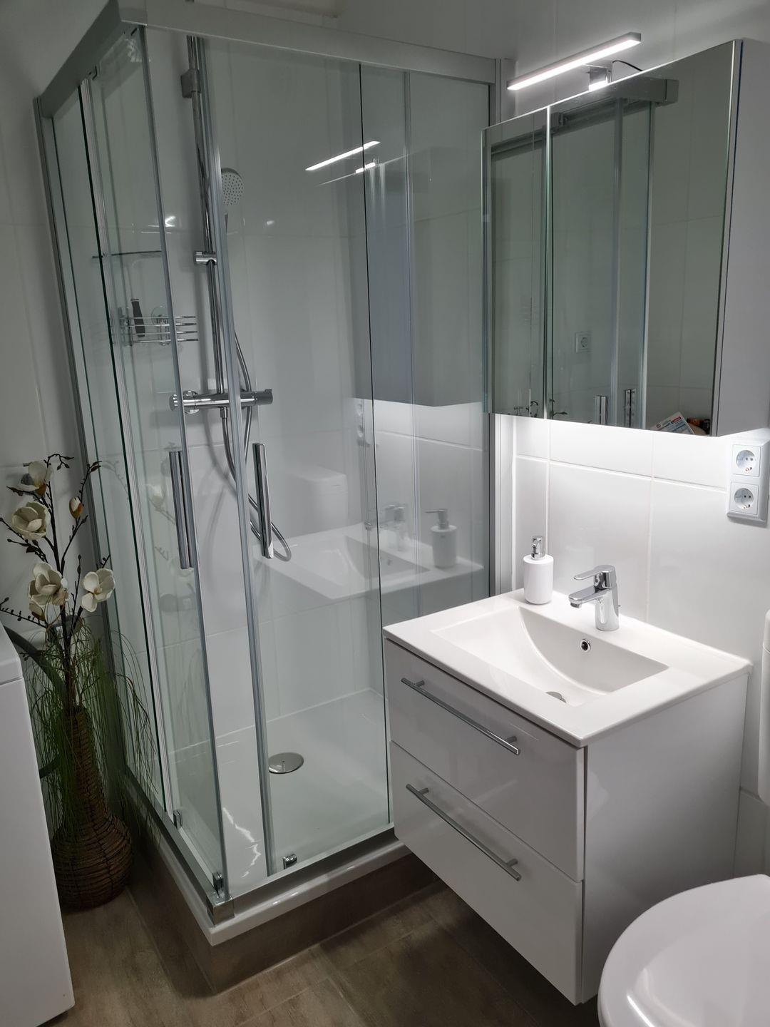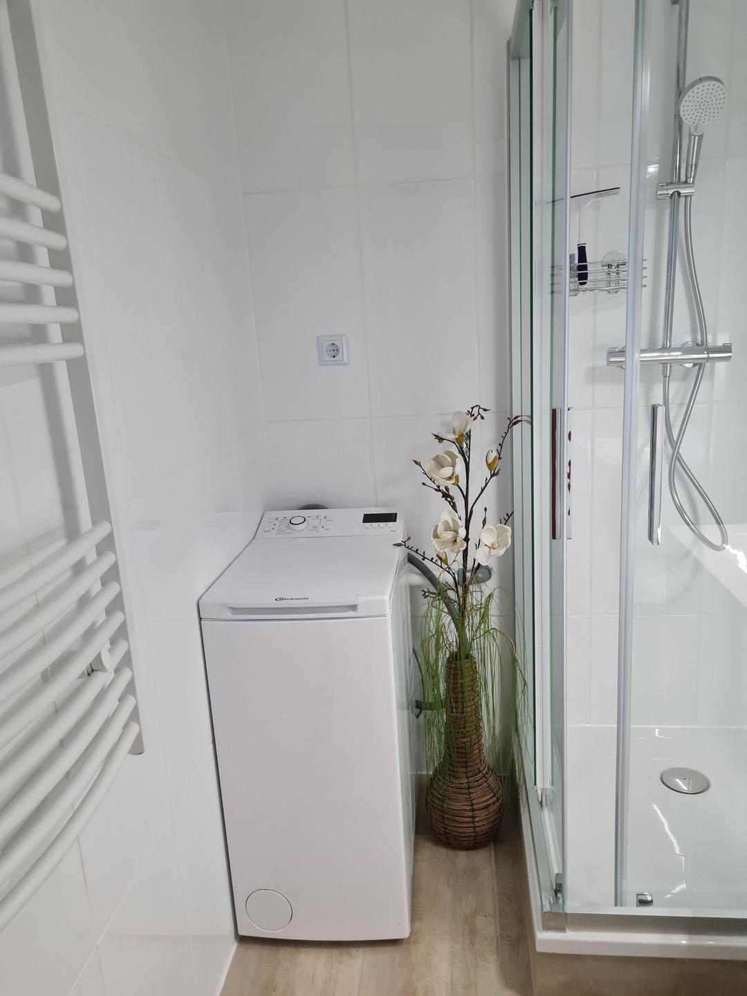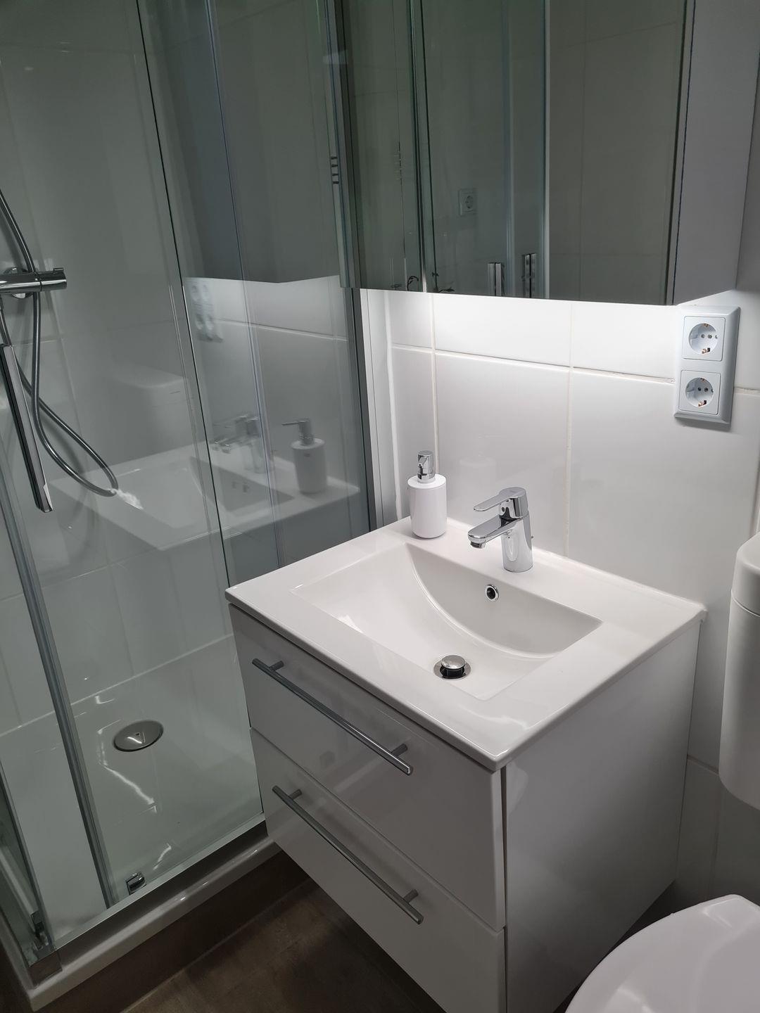 Das Bad hat neben der bodengleichen Dusche auch einen Handtuchwärmer, ein WC, einen Spiegel und ein Waschbecken. Im Bad befindet sich zusätzlich eine Waschmaschine.